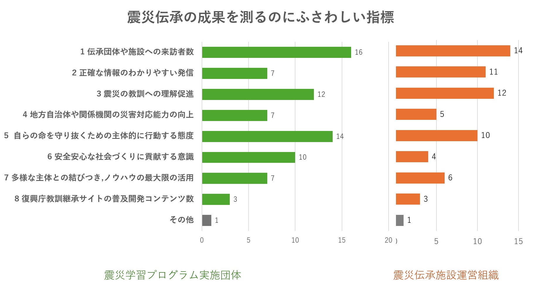 震災伝承の成果を測るのにふさわしい指標として、伝承団体、伝承施設共に「来訪者数」、「震災の教訓への理解促進」、「自らの命を守り抜くための主体的に行動する態度」が上位となった。