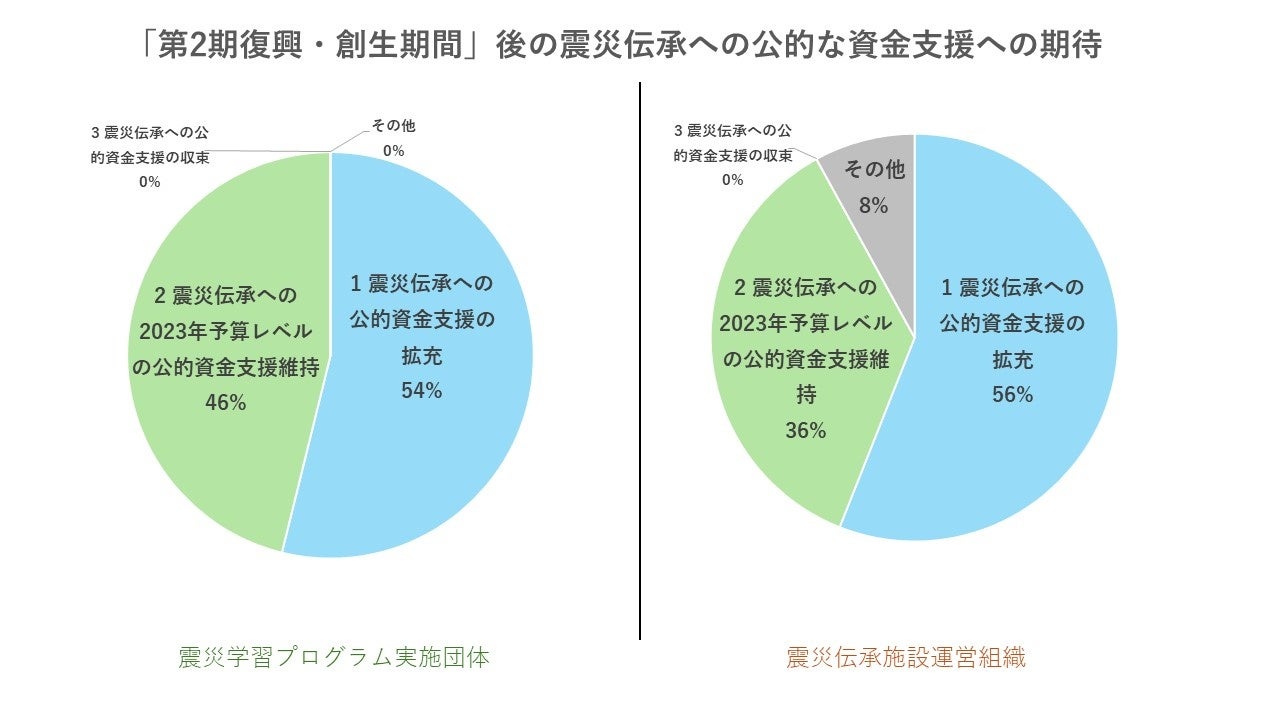 発災15年の「第2期復興・創生期間」後の公的資金支援への期待として、「収束」を良しとする回答はゼロであり、伝承団体、伝承施設のどちらも、過半数が「拡充」を期待していた。
