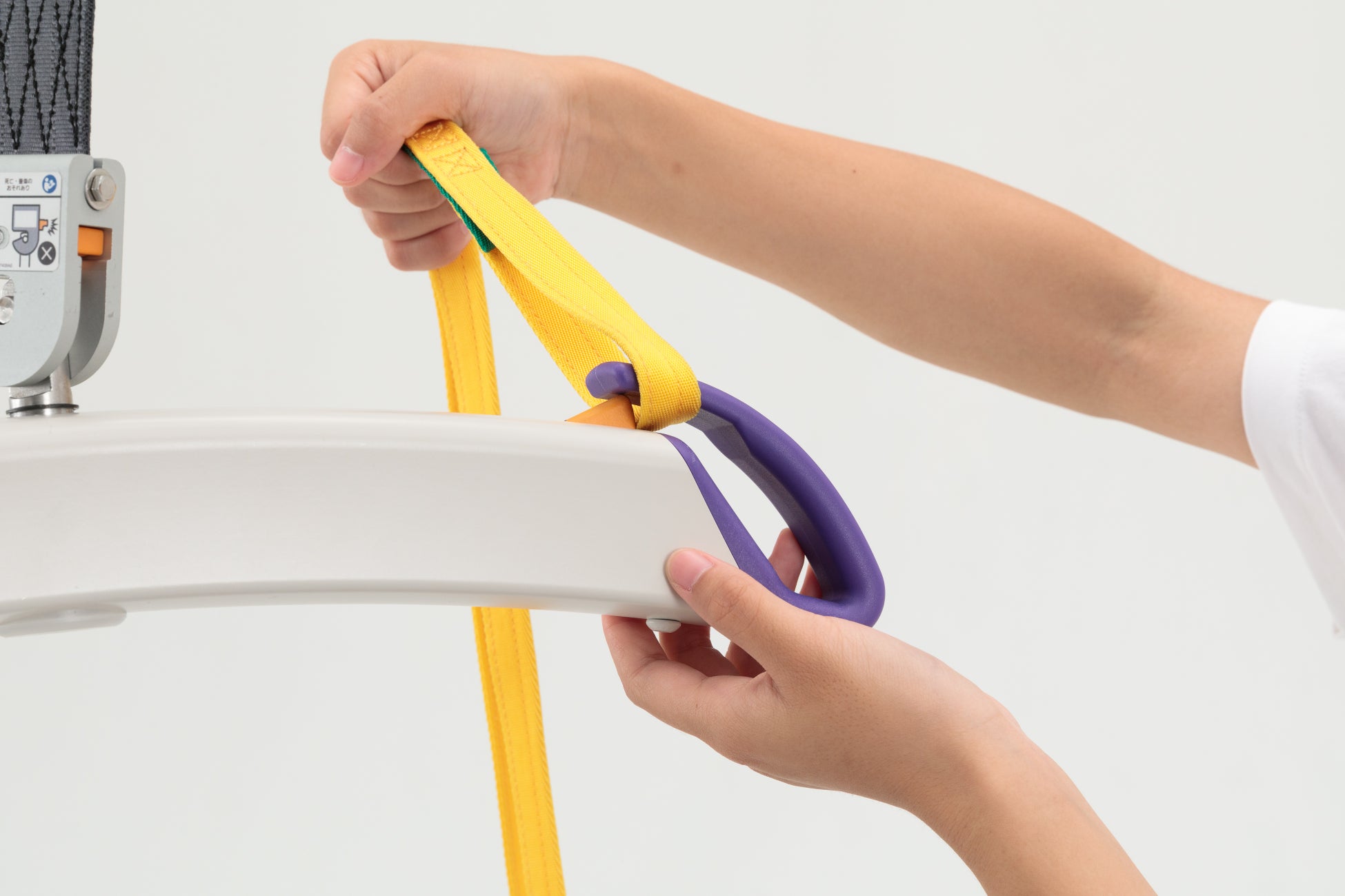吊り具の脱落を防止するセーフティラッチ構造を採用し、移乗時の安全性を確保。また、万が一、手元スイッチが故障などにより操作できなくなった場合でも、本体操作部から昇降操作(緊急さげ)が可能なため、非常時にも安心してご使用いただけます。