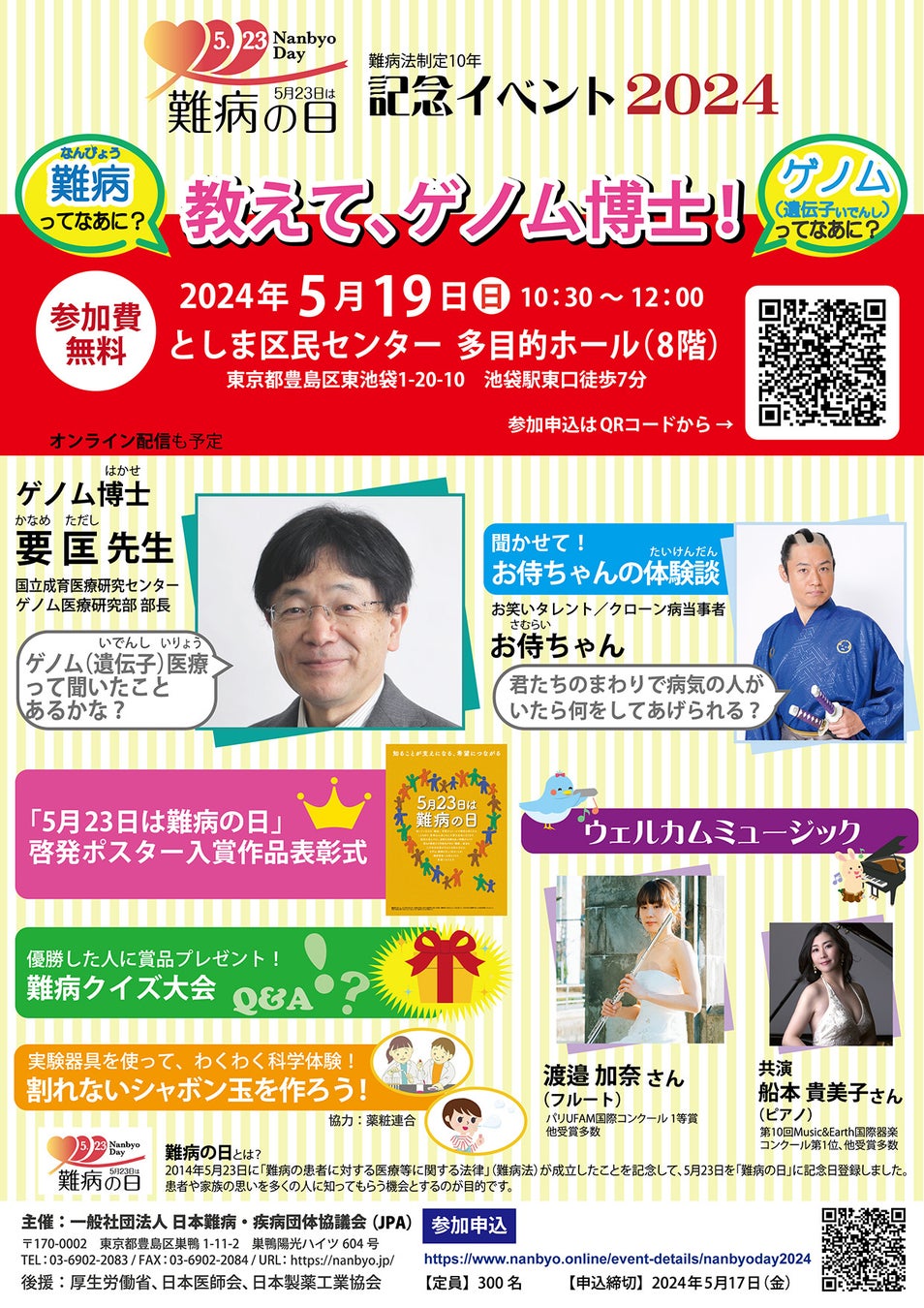 この「5月23日は難病の日」記念イベントは、難病法が成立した日を記念して、毎年5月に都内で開催しており、本年は、難病や、その新たな治療方法として期待されている遺伝子治療(ゲノム医療)を広く市民の方に知っていただくため、小学生から大人まで楽しめるプログラムで下記の通り実施します。