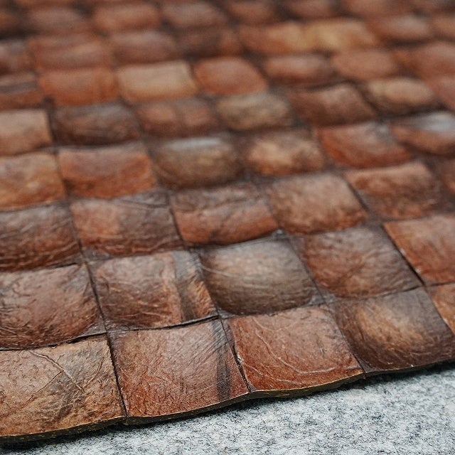 本製品は、本来廃棄されるココナッツ殻をチップ化し、内装材として再利用したアップサイクル素材から生まれた、天然素材の装飾用モザイクタイルです。家具・建具・間仕切りなどの装飾用途を想定し、天然素材を商空間で“使える意匠”として成立させることを目的に開発されました。