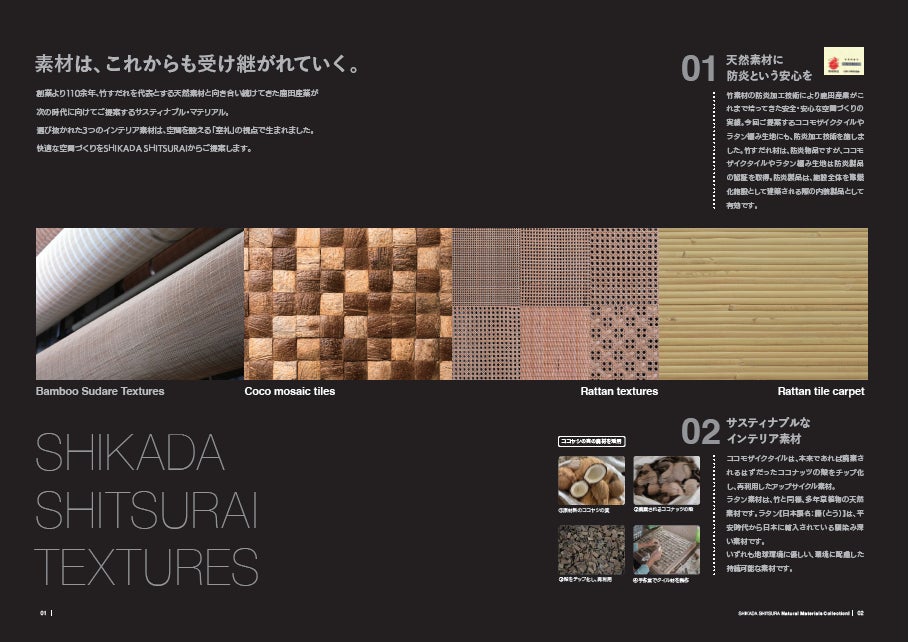 「鹿田室礼ナチュラルマテリアルコレクション」は、鹿田産業が竹すだれメーカーとして創業以来向き合ってきた天然素材と防炎技術の知見をもとに、商空間で実装可能な天然素材内装を体系的に提案するカタログです。本コレクションに収録する各製品は、素材特性や用途に応じて非防炎仕様と、防炎性能に配慮した仕様を用意しており、適用される防炎の区分や基準は製品ごとに異なります。