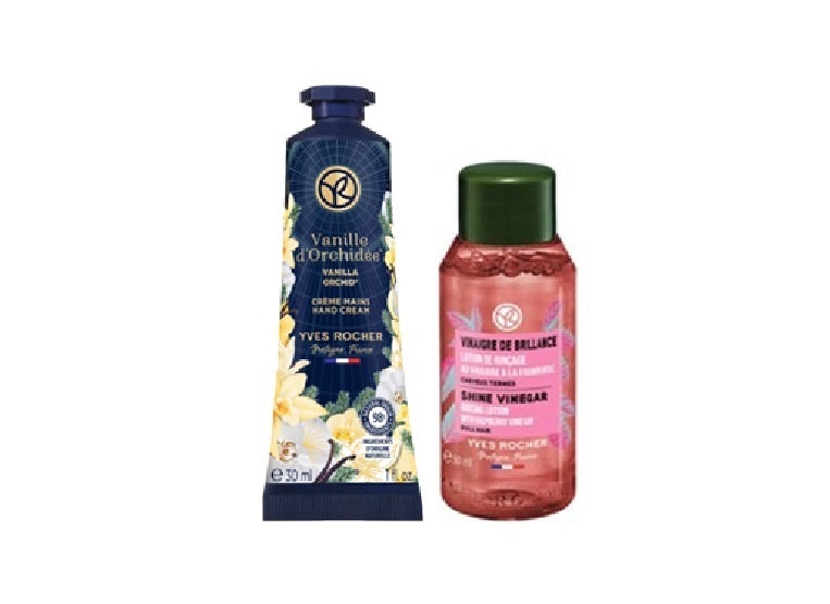 シアバター*¹配合で、しっとり伸びのよいハンドクリームと、イヴ・ロシェで人気のお酢*²のトリートメント、ラズベリーエキス*³の入ったリンシングビネガーの2点セット。頭皮を健やかに整え、髪や手先にツヤとうるおいを与えるプチサイズのキットです。