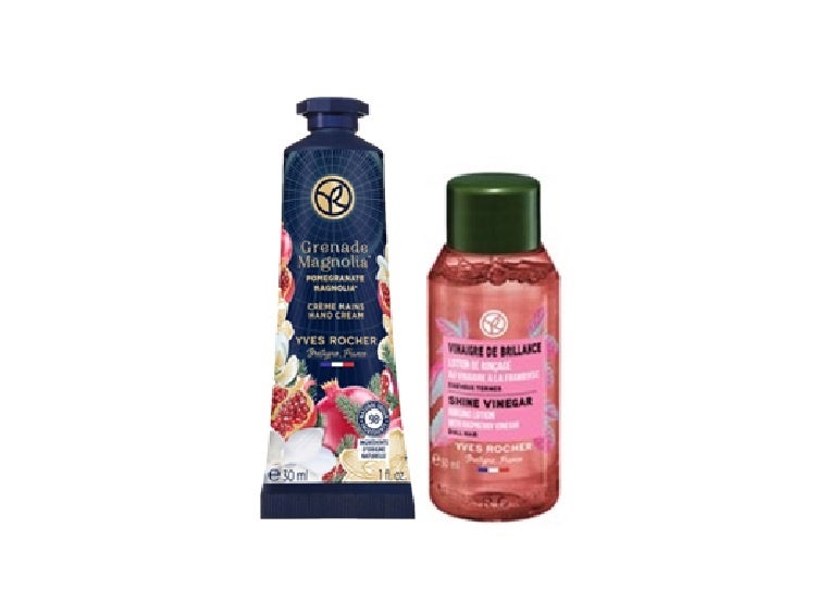 ざくろエキス*⁹とシアバター*¹、ヒマワリ種子油*⁵配合で、手先をしっとりなめらかに整えるハンドクリームと、イヴ・ロシェで人気のお酢*²のトリートメント、ラズベリーエキス*³の入ったリンシングビネガーの、ジューシーな香りの2点セット。頭皮を健やかに整え、髪や手先にツヤとうるおいを与えます。プチサイズで、トライアルとしてもおすすめ。自分へのご褒美や、ご友人へのプレゼントとしても。