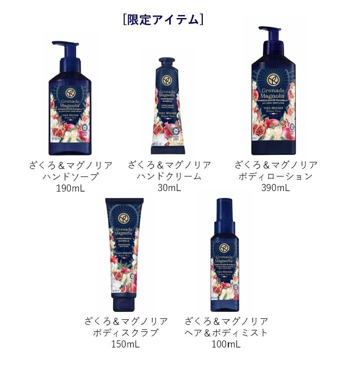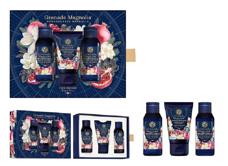 バス&シャワージェル、ボディスクラブ、ボディローションがセットになった、コンパクトサイズのボディケアキット。ビタミンEが豊富なざくろエキス*⁹配合で、透明感のある健やかな肌に導きます。イヴ・ロシェで好評いただいたフローラルなマグノリアと、甘くフルーティなざくろの香りがミックスされた、華やかなフルーティフローラルの香り。