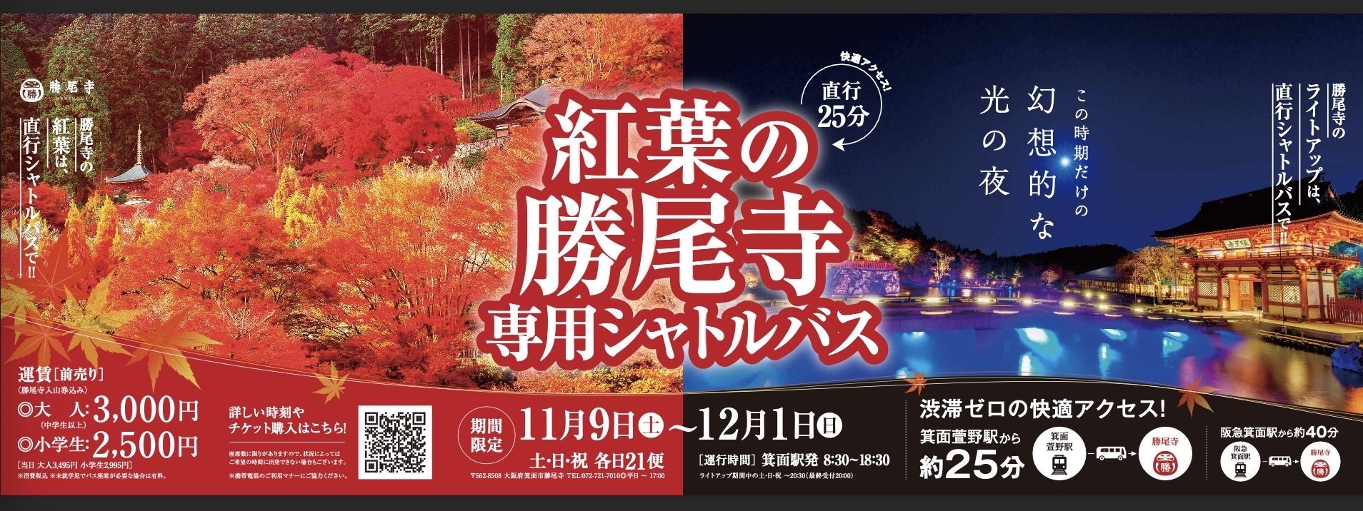 また同日には、阪急交通社様によって、阪急「箕面駅」・北大阪急行電鉄「箕面萱野駅」と、勝尾寺間において紅葉シャトルバスが運行される予定です。