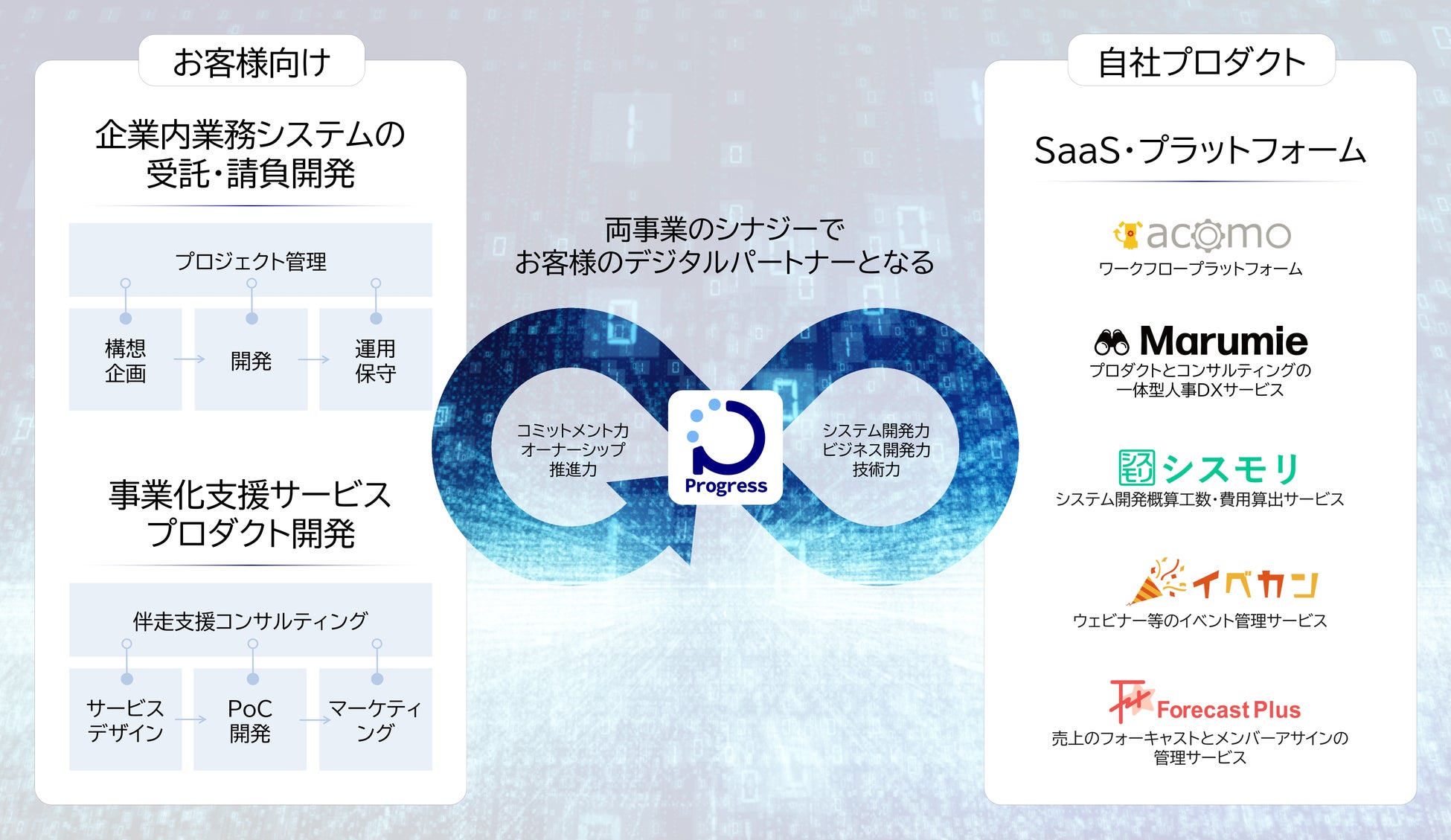 プログレスは、スクラッチによるシステム開発の企画・開発を主とし、Webアプリケーションの設計開発から、クラウド・インフラ構築まで、お客様のIT化業務課題を解決するシステム構築・サービス開発・運用保守といったサービスや、プロジェクト管理オフィス(PMO)の役割として、プロジェクトの円滑な遂行を支援するプロジェクト管理サービスを提供しています。