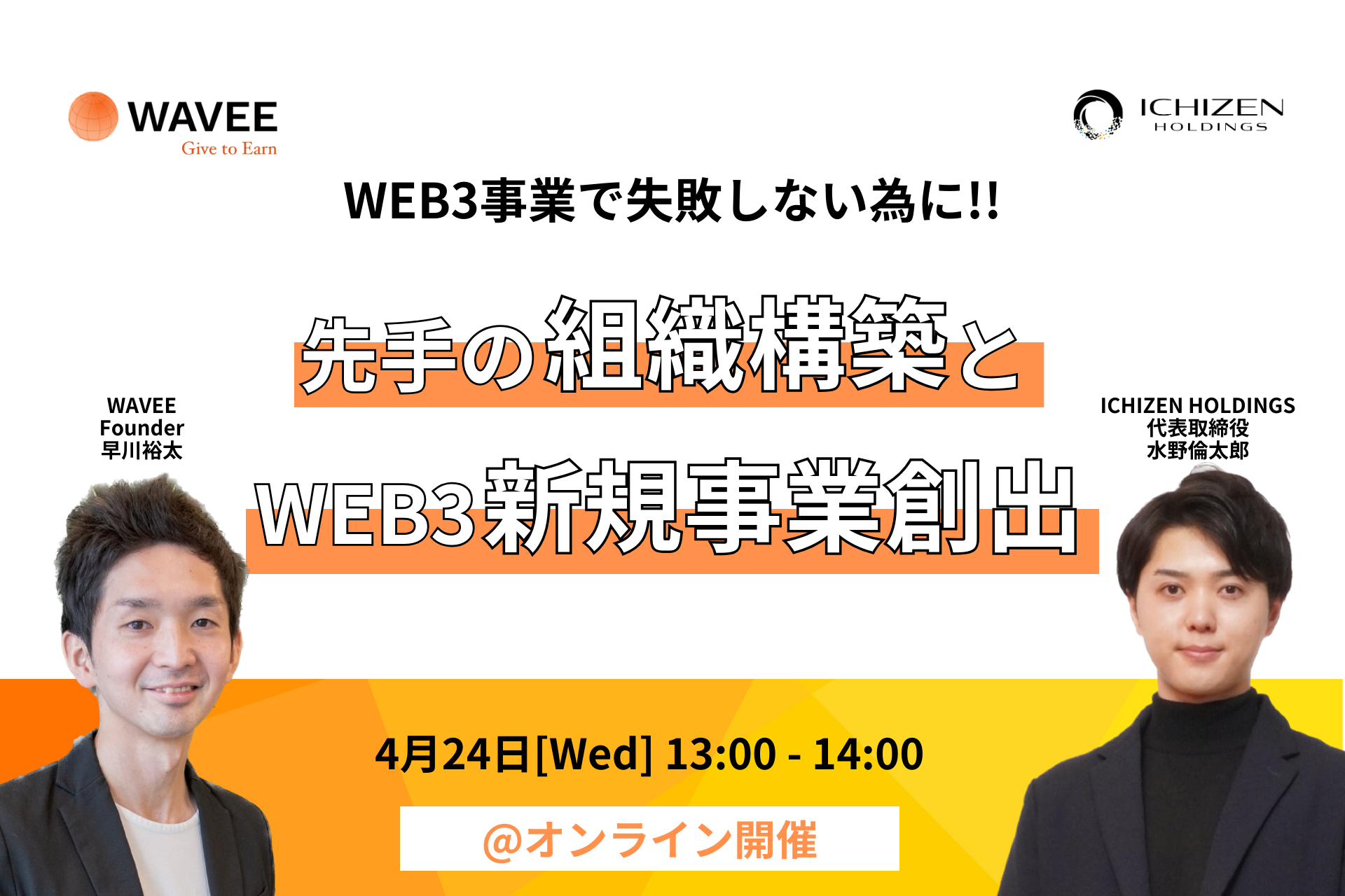 株式会社ICHIZEN HOLDINGS(東京都渋谷区、代表:水野倫太郎)は、2024年4月24日(水)13:00より無料ウェビナー「Web3事業を成功に導く【先手の組織構築】と【WEB3事業創出方法】」を開催いたします。