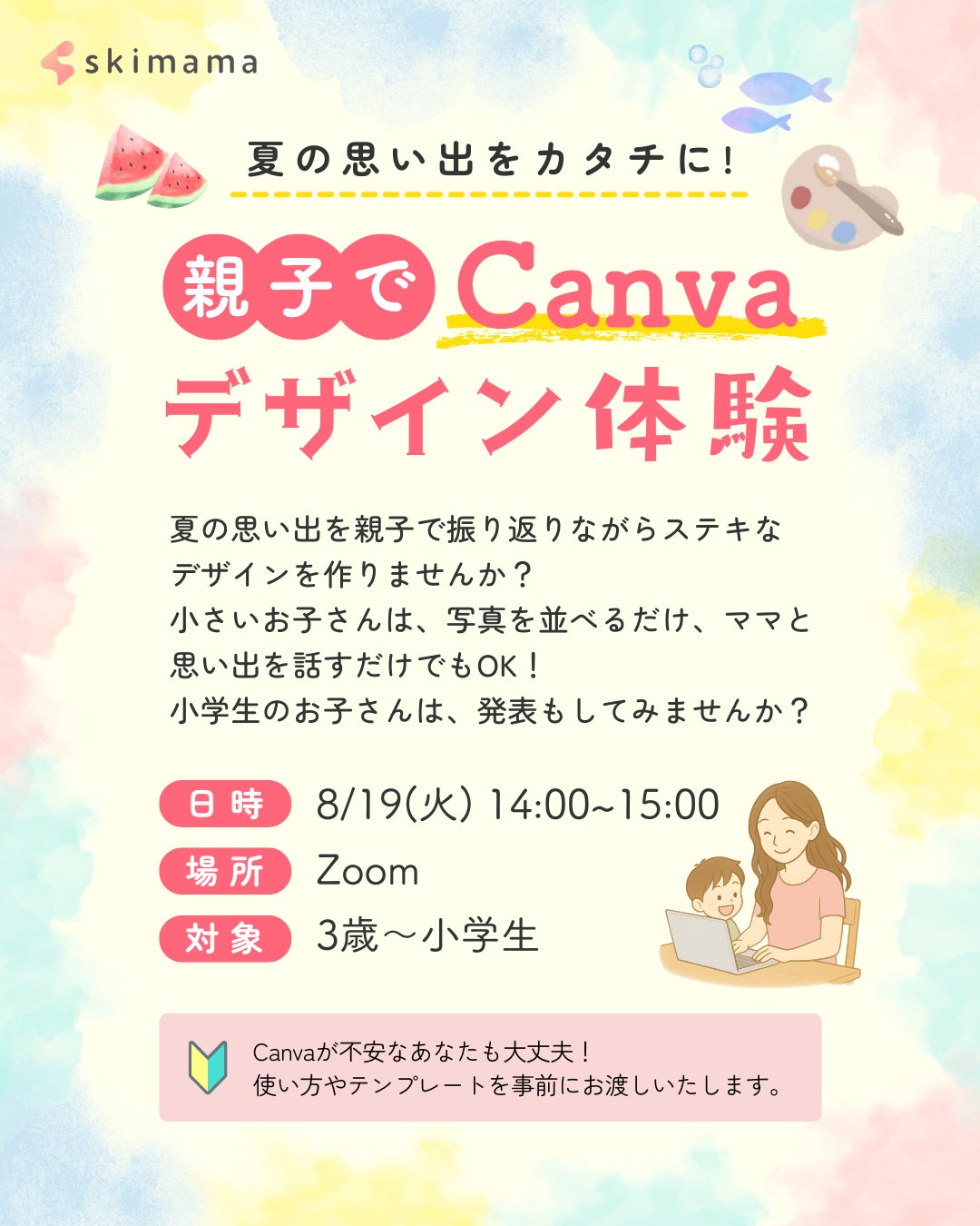 ママ向け在宅ワーク支援スクールskimamaは「親子でCanvaデザイン体験」を無料開催。夏の思い出をデザインにしながら、学びも親子の絆も深めませんか?