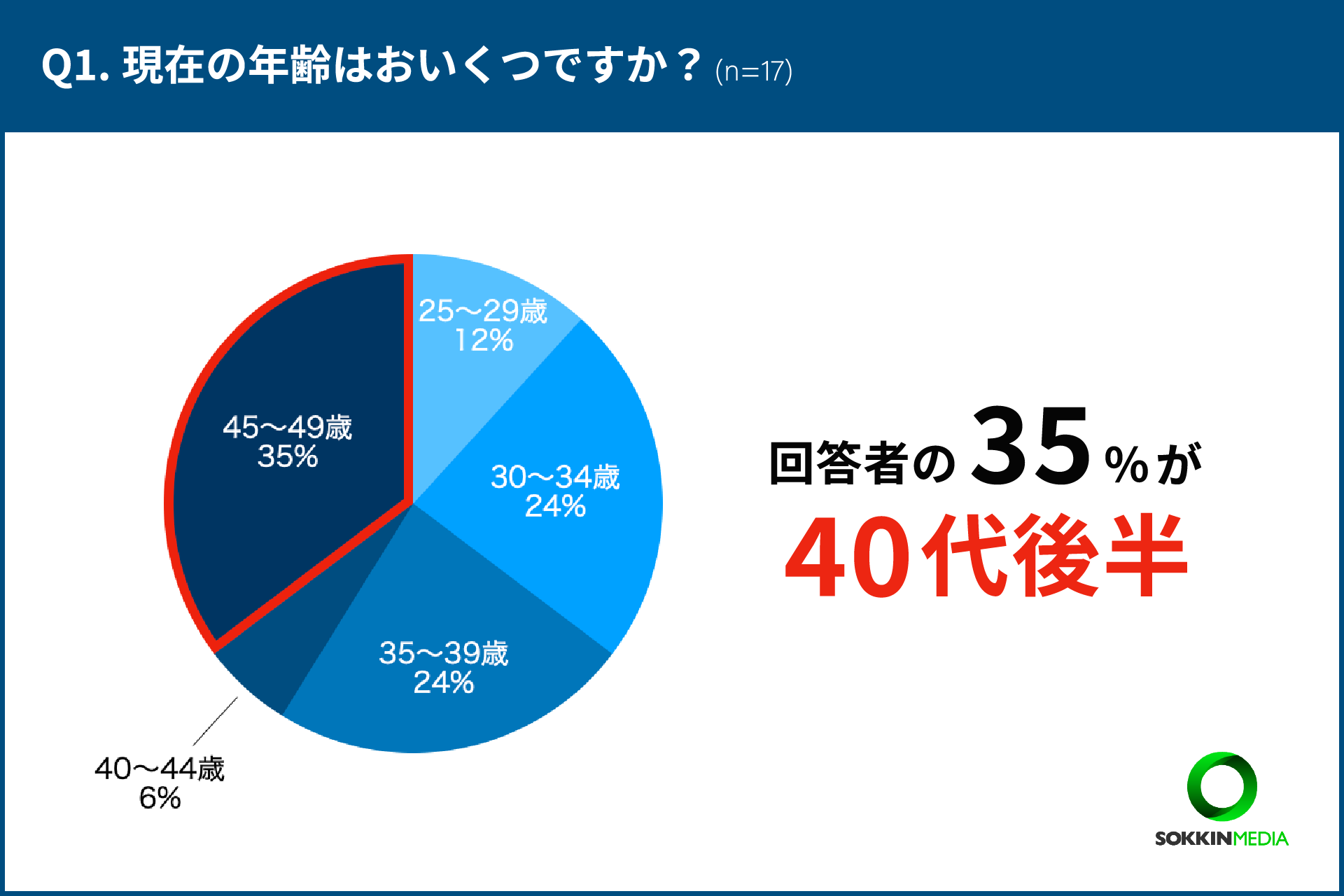 「Q1.現在の年齢はおいくつですか?」という問いに対して、「45〜49歳」という人が最も多く全体の35%を占めました。次いで「30〜34歳」「35〜39歳」が24%となっています。