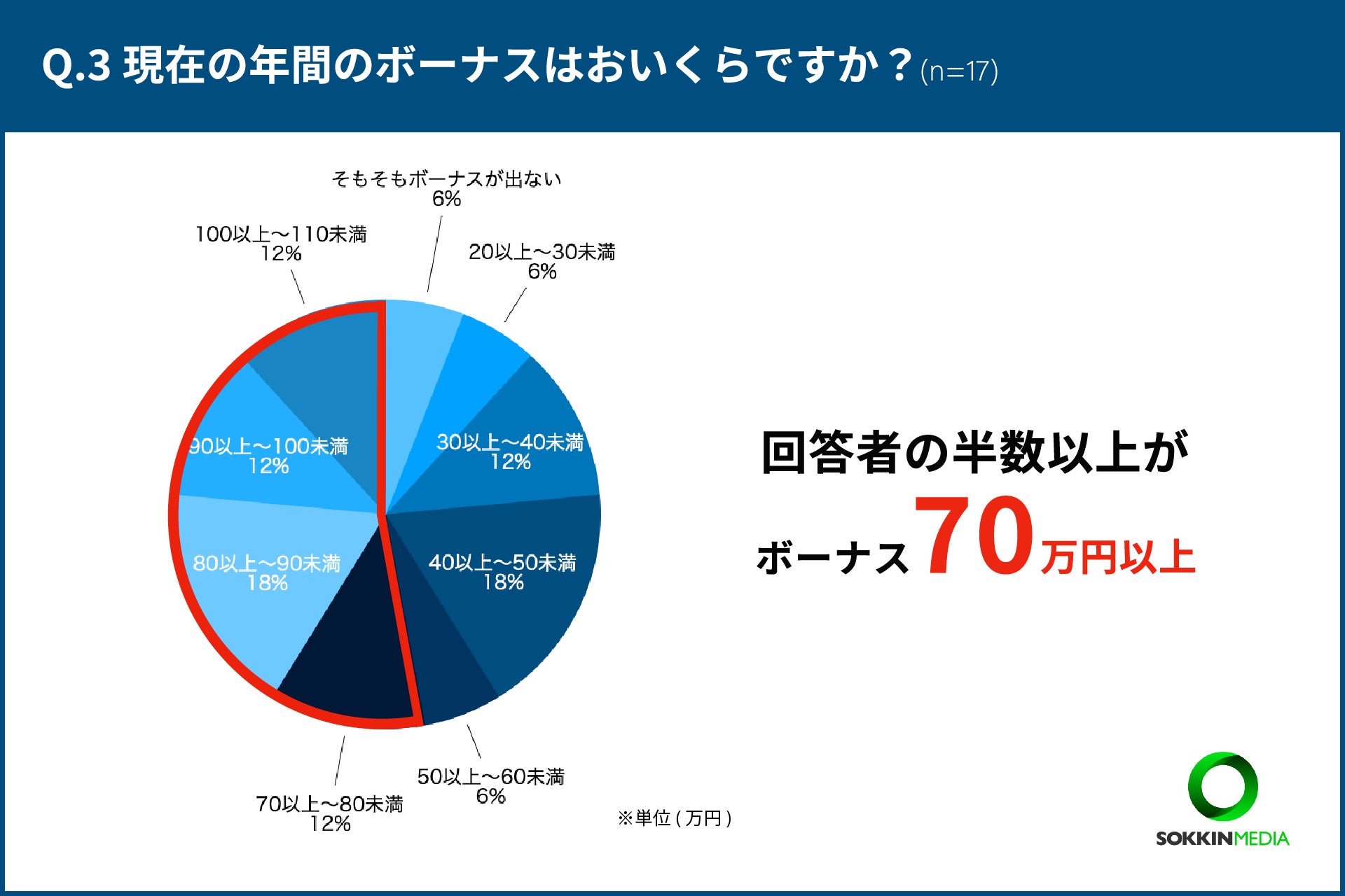 「Q3.現在の年間のボーナスはおいくらですか?」という問いに対して、回答者の半数以上がボーナスを年間で70万円以上もらっていると回答しました。ボーナスの額にはばらつきが見られ、30万円未満と答えた方が12%いる一方で、100万円以上と答えた方が12%いました。