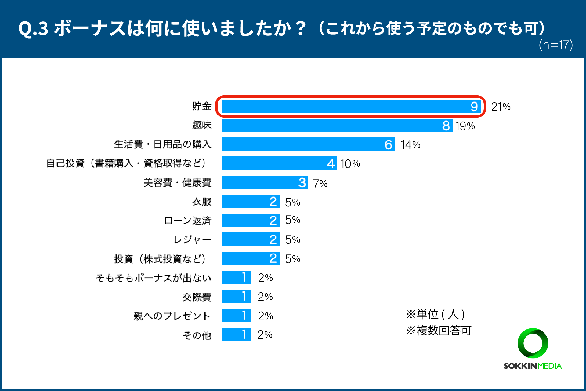 「Q3.ボーナスは何に使いましたか?(これから使う予定のものでも可)(複数選択可)」という問いに対して、「貯金」をあげた方が最も多く全体の21%(9票)を占めました。次いで、「趣味」が19%(8票)という結果になりました。