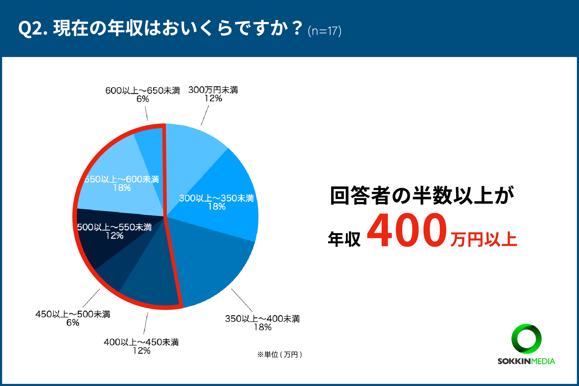 「Q2.現在の年収はおいくらですか?」という問いに対して、回答者の半数以上が年収400万円以上と回答しました。年収にはばらつきが見られ、300万円未満と回答した方が12%いる一方で、550万円以上と回答した方は24%いました。