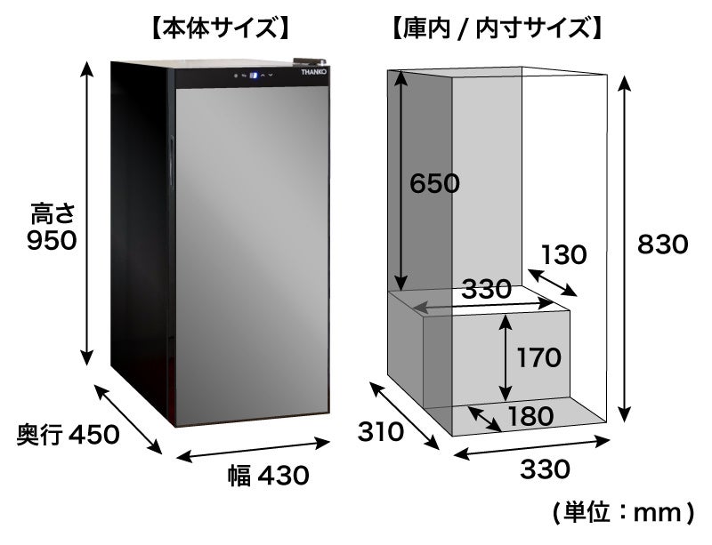 サイズは幅430×奥行き450×高さ950mm。一升瓶を立てたまま12本(下段9本、上段3本)収納可能。家庭用冷蔵庫と同じコンプレッサー方式を採用し、しっかりと冷やすことができます。