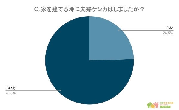 また「家を建てる際に夫婦喧嘩をしたか」について聞いたところ、「はい」と答えた人は102人(24.5%)、「いいえ」は314人(75.5%)という結果に。約4人に1人が、家を建てる際にパートナーと喧嘩した経験があることがわかりました。