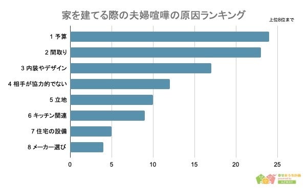 続いて「夫婦喧嘩の原因は何か」について聞いたところ、1位が「予算(24人)」、2位が「間取り(23人)」、3位が「内装やデザイン(17人)」という結果になりました。「予算」で喧嘩をした人たちは、予算ギリギリまで使うか、補修など今後のために余裕を残しておくかで揉めたという意見が見られました。