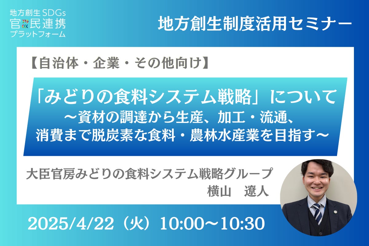 農林水産省の担当者登壇!4/22(火)自治体・企業向け、「みどりの食料システム戦略」について~資材の調達から生産、加工・流通、消費まで脱炭素な食料・農林水産業を目指す~オンラインセミナー開催のお知らせ