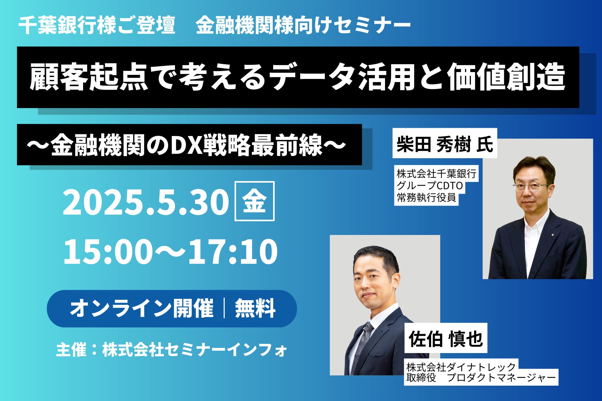 5/30(金)15時より、セミナーインフォ社主催セミナー「顧客起点で考えるデータ活用と価値創造~金融機関のDX戦略最前線~」千葉銀行様と共に登壇します