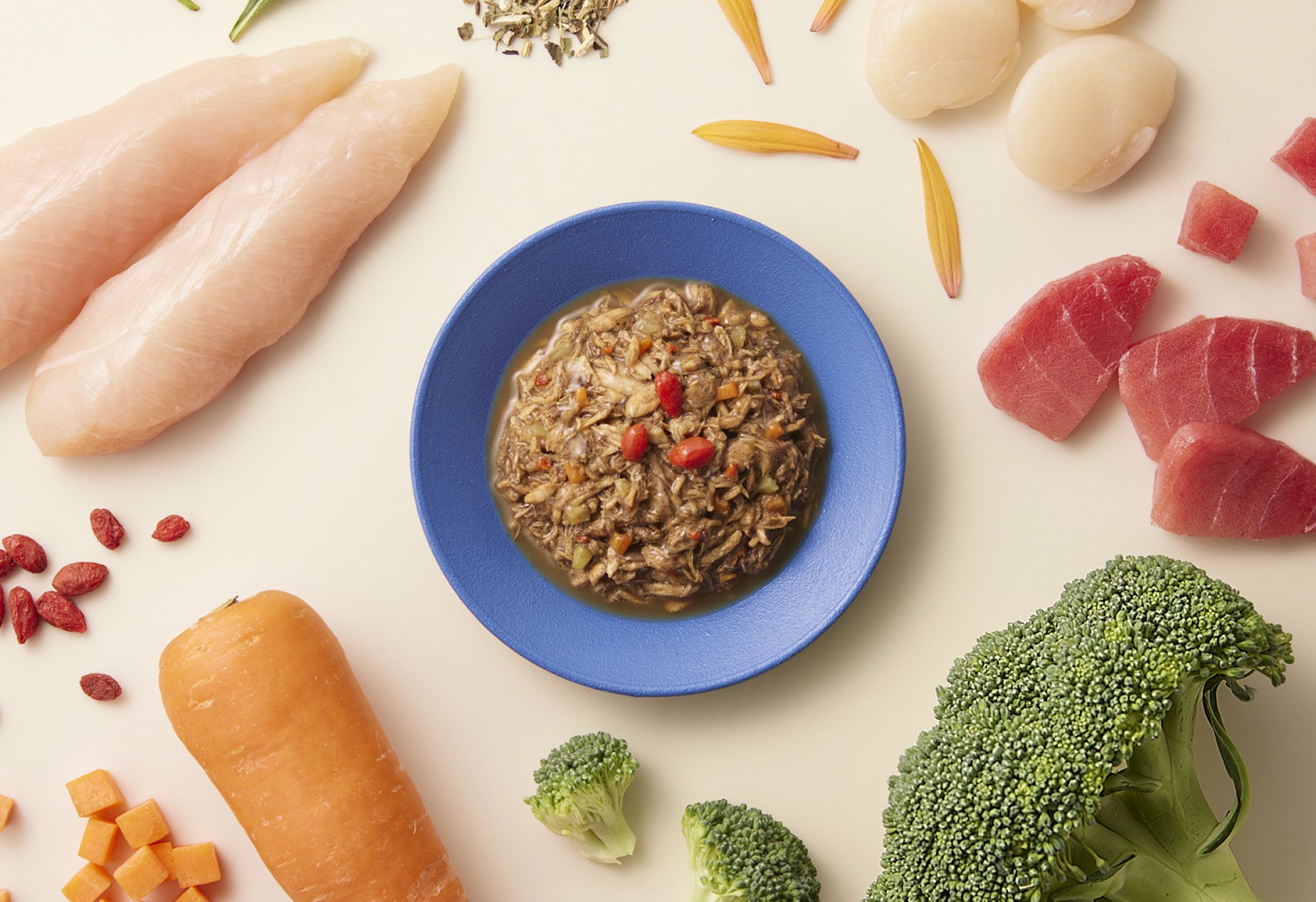 原材料:まぐろ、鶏肉、にんじん、ブロッコリー、ホタテエキス、米でん粉、加水分解チキン、フィッシュオイル(オメガ3脂肪酸源)、サイリウム(食物繊維源)、フラクトオリゴ糖(プレバイオティクス源)、エキナセア、クコの実パウダー、タウリン