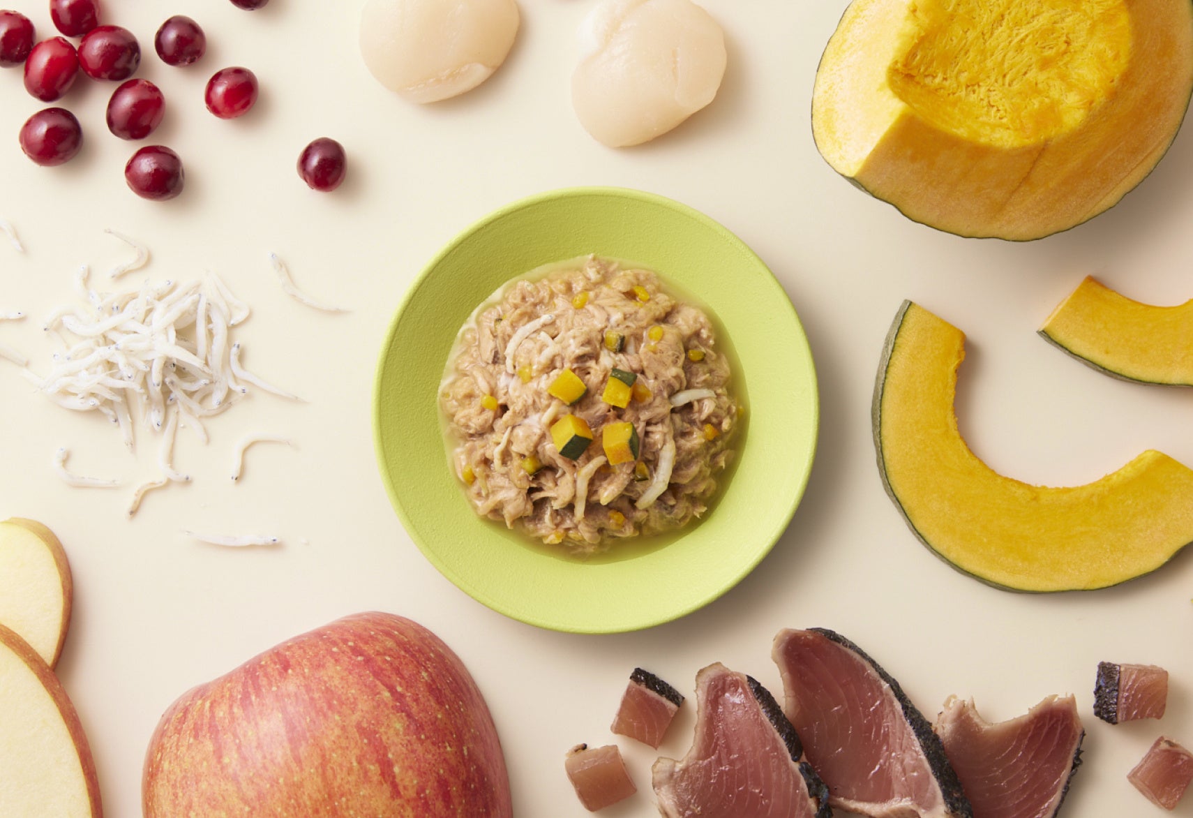 原材料:かつお、りんごピューレ、かぼちゃ、しらす、ホタテエキス、米でん粉、加水分解フィッシュ、フィッシュオイル(オメガ3脂肪酸源)、加水分解ミルクプロテイン、デキストリン、クランベリー、はぴねす乳酸菌、タウリン、L-トリプトファン
