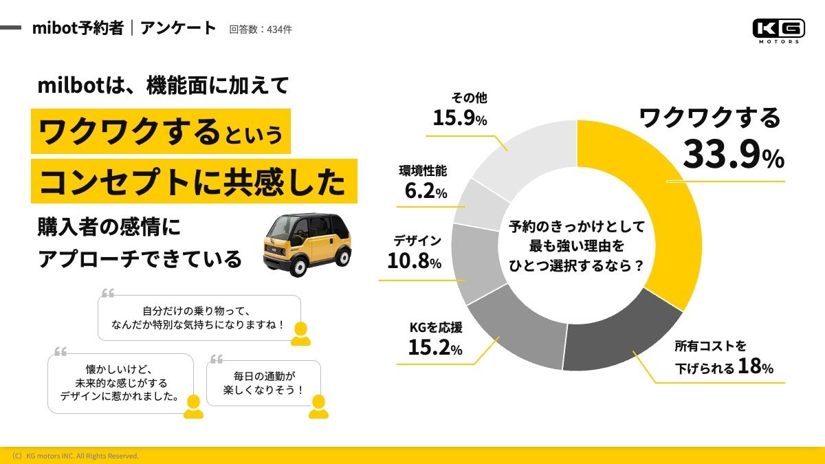 今回の1,000台という早期予約達成は、mibotが多くの個人ユーザーに「ワクワク感」を提供した結果です。予約者を対象に実施したアンケートによると、最も多くの方がmibotを選んだ理由として挙げたのは「新しい乗り物にワクワクするから」でした(全体の約33.9%)。レトロで懐かしさを感じさせるデザインと先進的なコンセプトが、共感と感情的なつながりを生んでいます。 mibotの経済性や環境性能といった実用的な要素も、使い勝手を考慮したサイズ感とともに、多くの方々に評価されていますが、ユーザーが単にコストや性能だけでなく、「乗りたい」「体験したい」という感情的な魅力が、選ばれた最大の理由であることが明らかになりました。