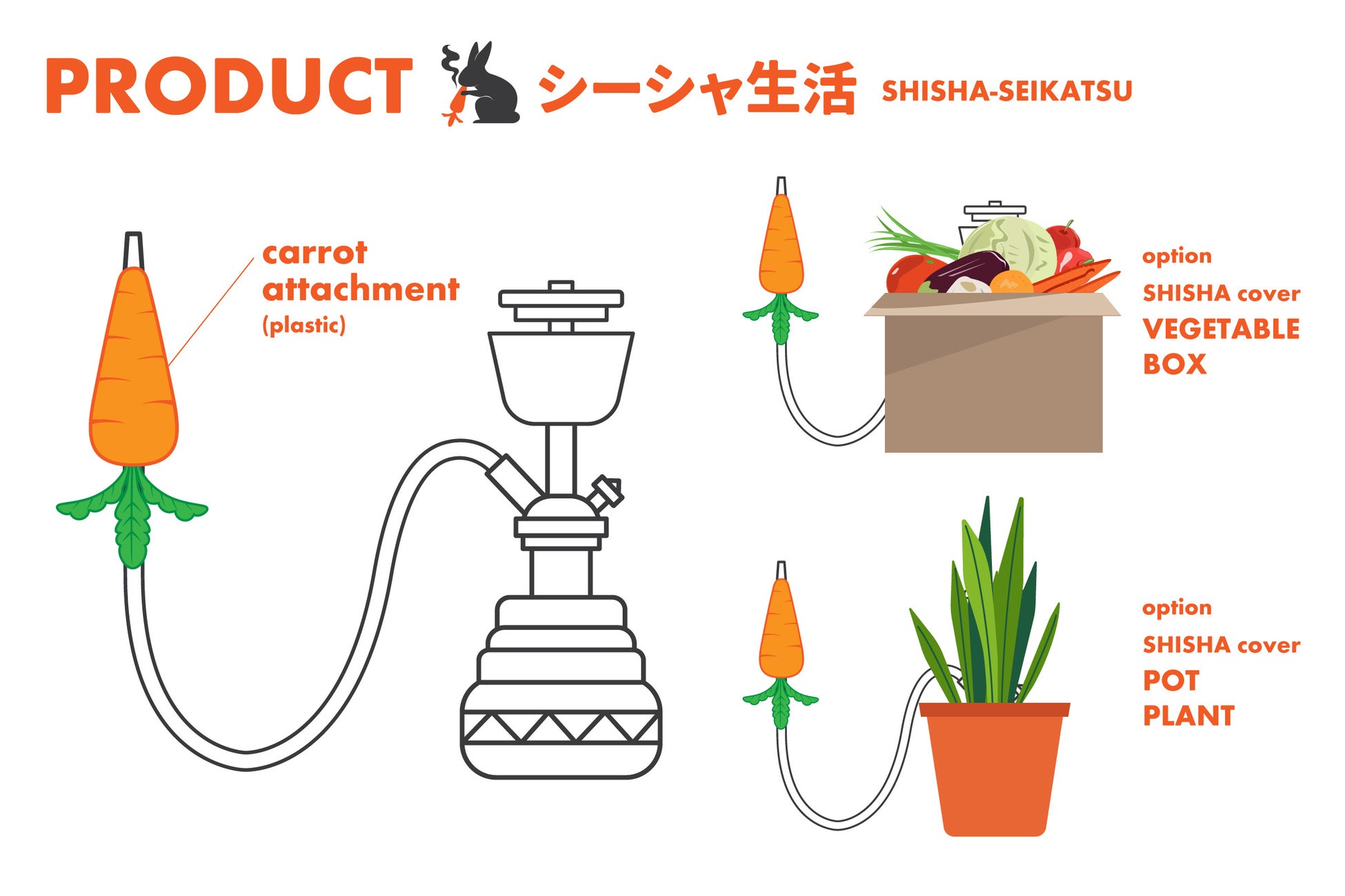 人参をかじっていると思わせて、シーシャを吸っている、その為だけに生まれたプロダクト。シーシャ本体用の野菜ボックス型カバーや、鉢植え型カバーも計画中。