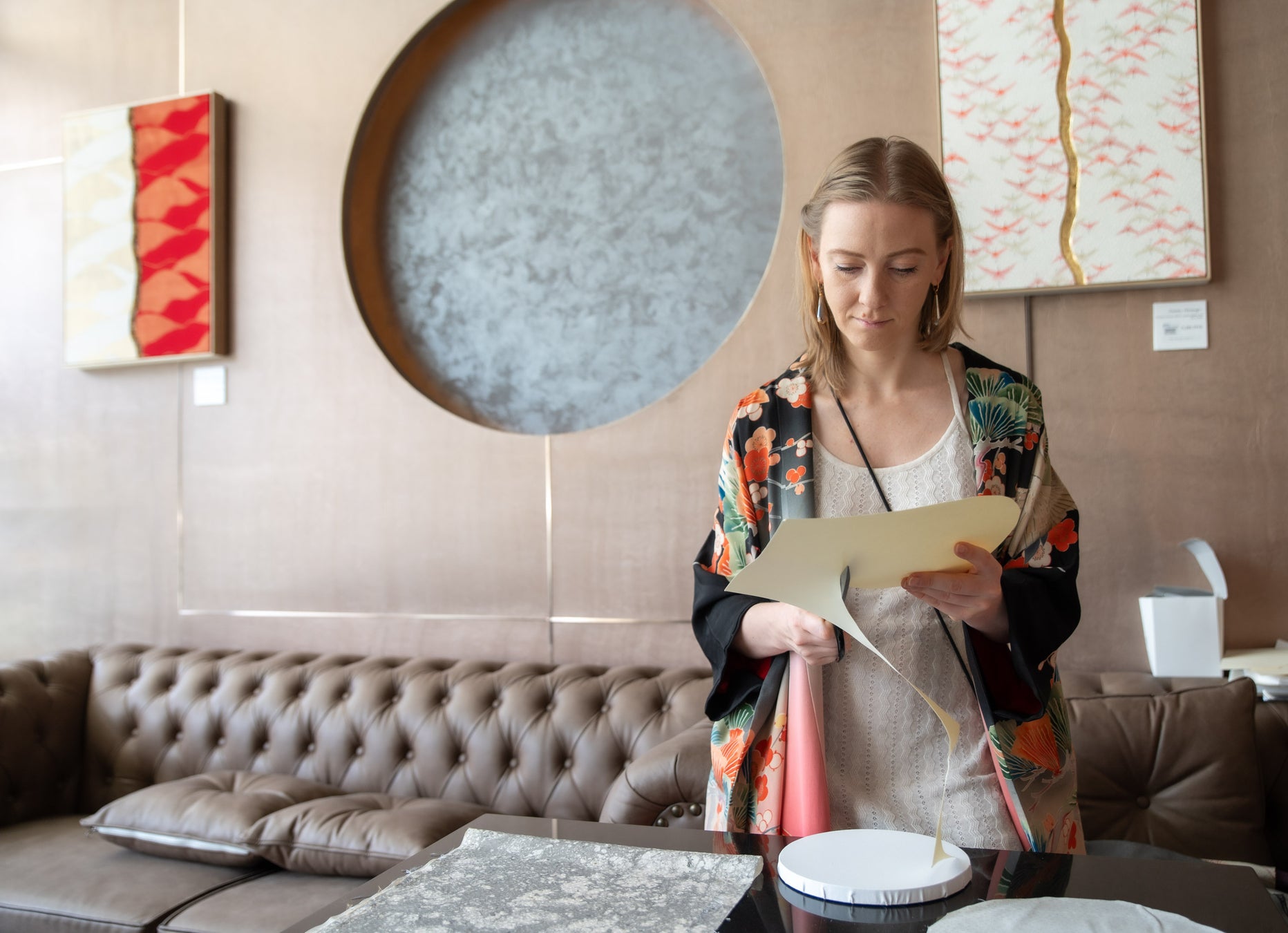 今回のイベントは、特別な体験として、アーティストのLena Okamoto自らが東京から100枚以上の厳選されたアンティーク着物生地を持参。お客様がお好きな生地をお選びいただき、Lena Okamotoがその場でお客様だけの唯一無二のアート作品へと生まれ変わらせるオーダーメイドサービスを提供いたしました。
