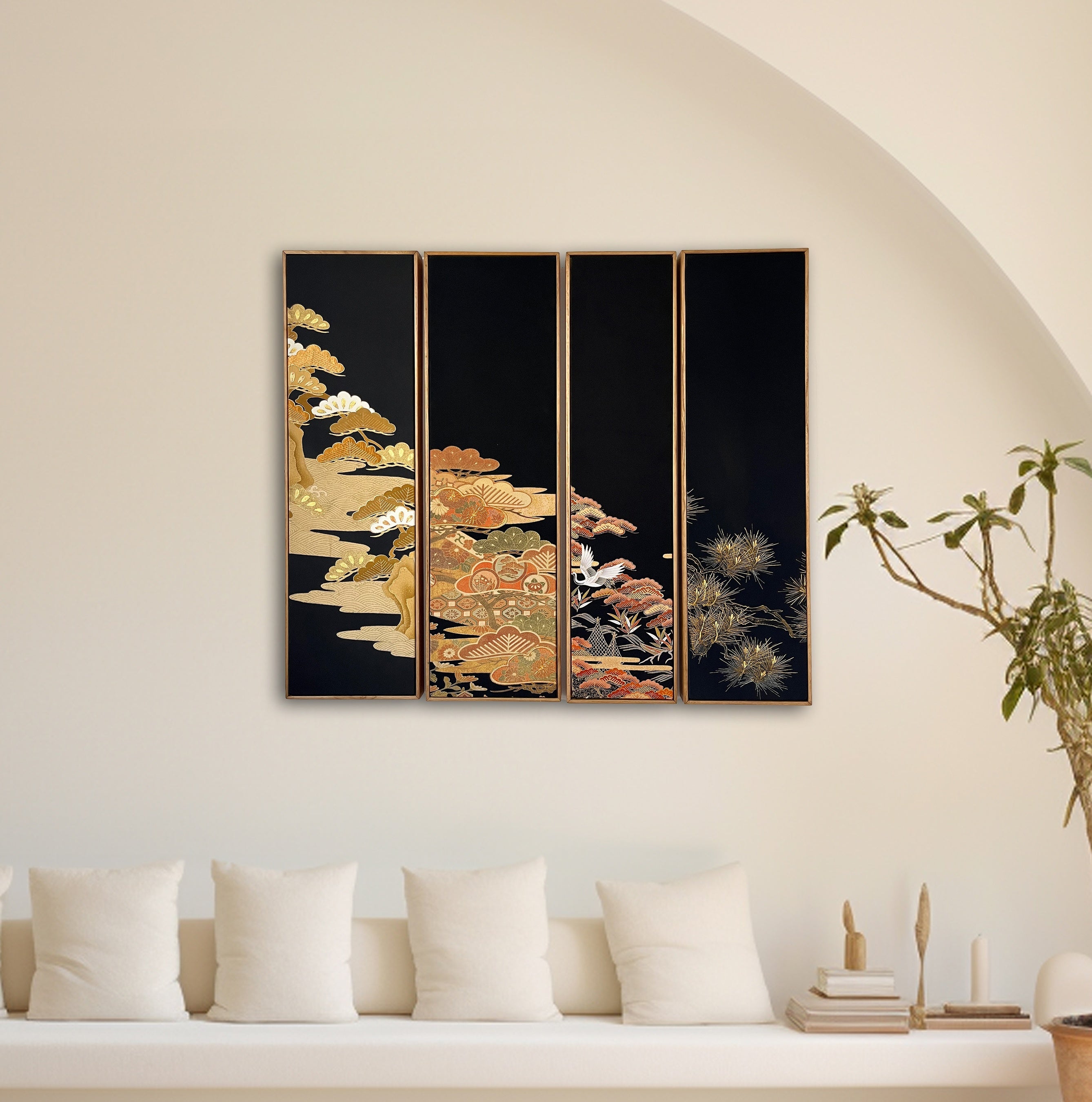 She meticulously selects antique kimonos from across Japan, transforming them into new works of art. We practice thorough upcycling, such as repurposing antique paulownia chests as frames.
