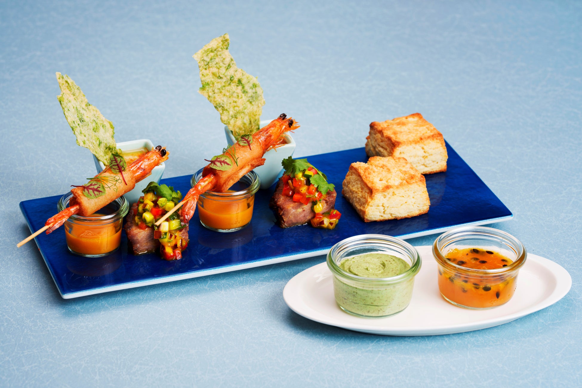 アーサーチュイルとマンゴーフムス、ソフトシェルシュリンプとマンゴーチリソース、豚肉コンフィとマンゴーサルサ