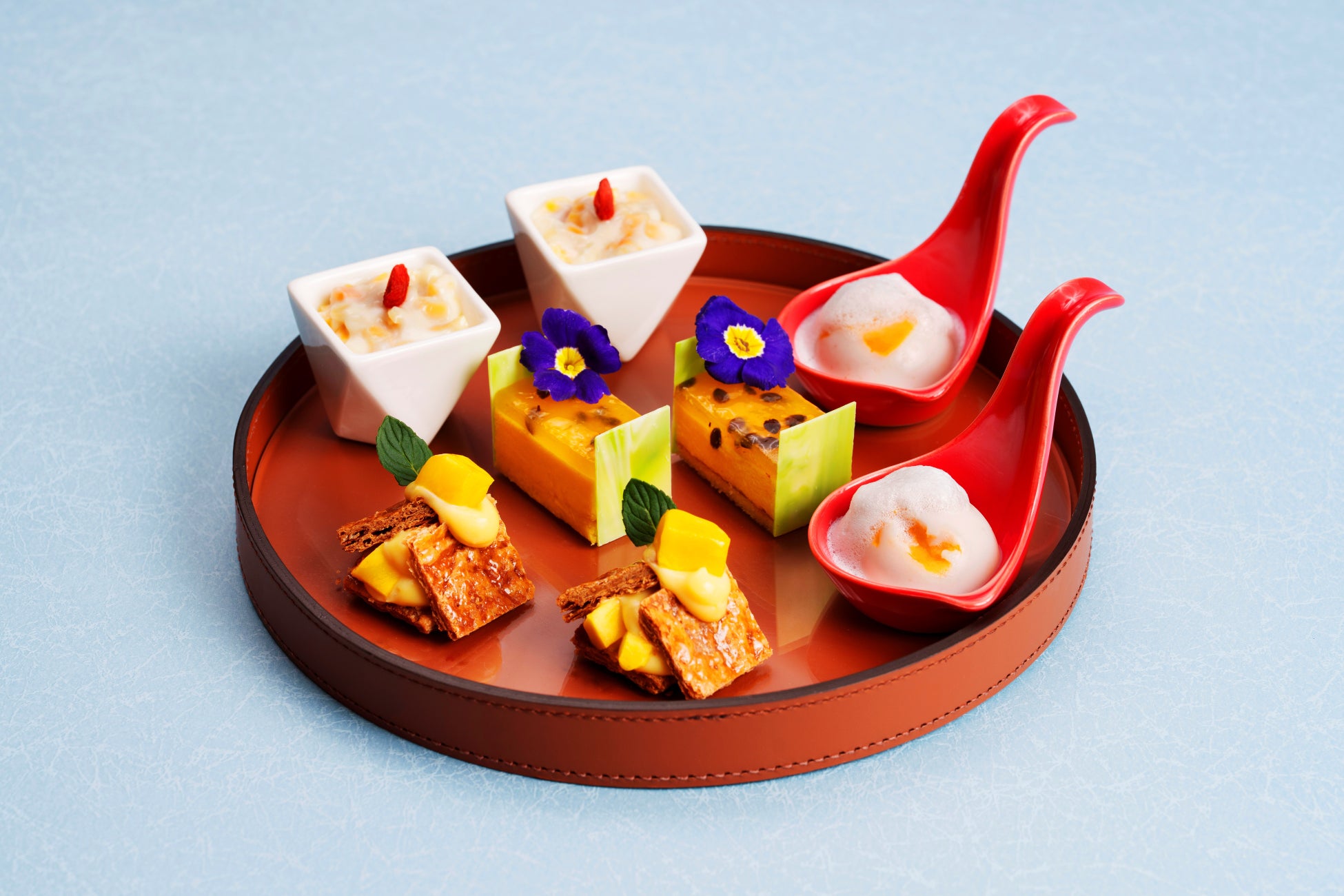セイボリーには、沖縄の岩場に生える海藻「アーサー」のチュイルにマンゴーフムスを合わせた「アーサーチュイルとマンゴーフムス」やスパイシーなマンゴーチリソースで味わう「ソフトシェルシュリンプとマンゴーチリソース」、さっぱりとしたマンゴーサルサが豚肉の旨みを引き立てる「豚肉コンフィとマンゴーサルサ」をご用意。マンゴーの甘みと塩味の絶妙なバランスが、アフタヌーンティーをより奥深く彩ります。