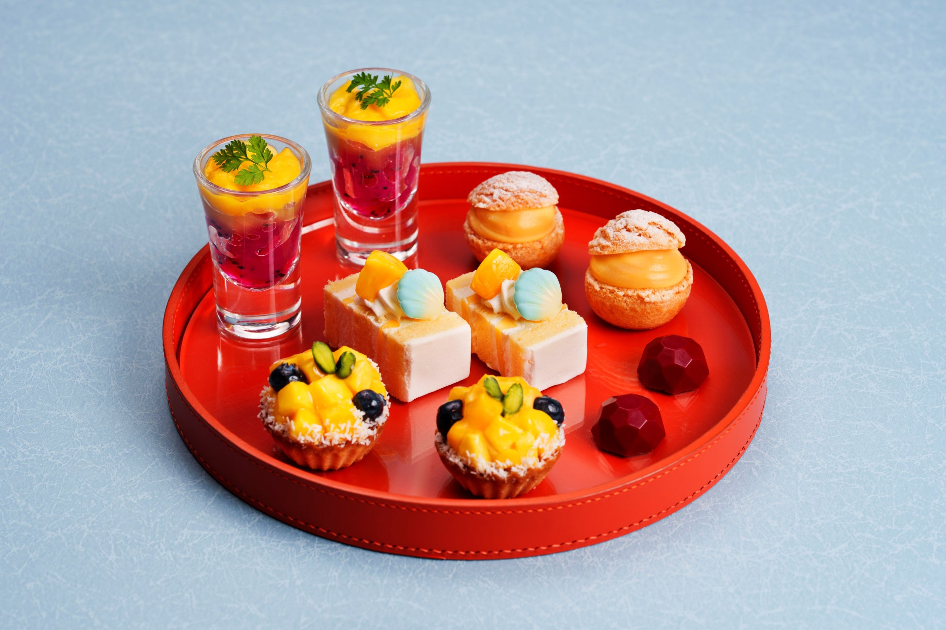 マンゴーココナッツジュレ、マンゴーシュークリーム、マンゴーとドラゴンフルーツのヴェリーヌ、マンゴーショートケーキ、マンゴータルト、マンゴーボンボンショコラ、マンゴーラッシームース、マンゴーミルフィーユ、マンゴーとパッションケーキ