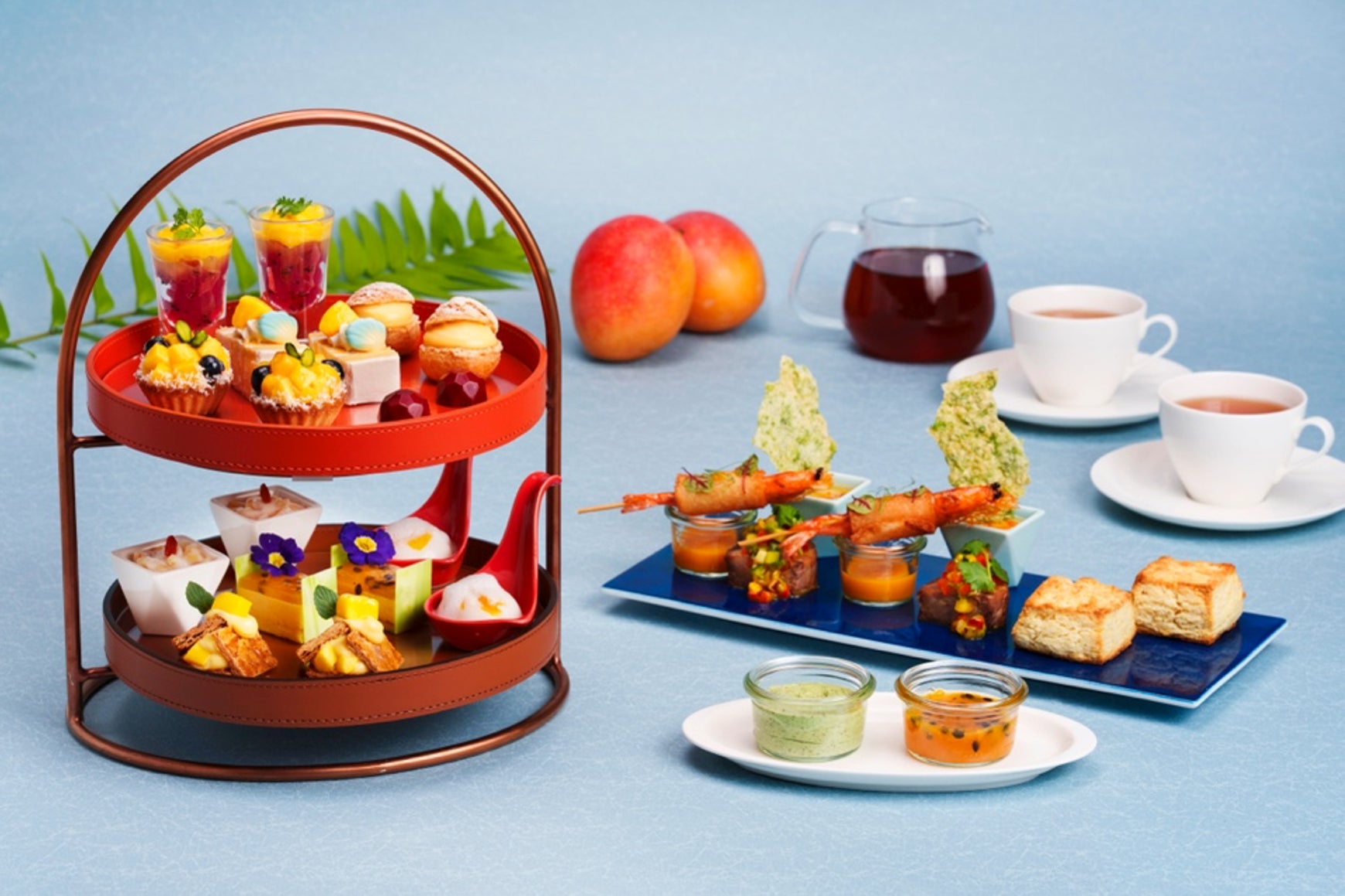 このアフタヌーンティーでは、太陽の日差しをたっぷり浴びて育ったフレッシュマンゴーを贅沢に使用したスイーツ9種、セイボリー3種、スコーンにオリジナルジャムやバターを添えてお楽しみいただけます。フレッシュマンゴーの豊かな甘みと香りを活かしたスイーツは、味わいはもちろん、色鮮やかなビジュアルも魅力。南国を感じさせるラインナップでお届けします。
