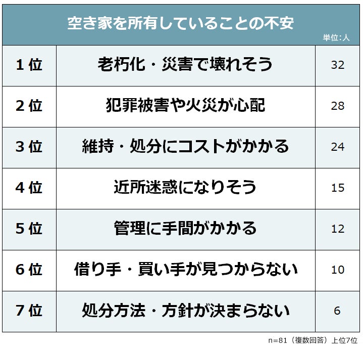 その結果、1位は「老朽化・災害で壊れそう(32人)」でした。続いて2位「犯罪被害や火災が心配(28人)」、3位「維持・処分にコストがかかる(24人)」、4位「近所迷惑になりそう(15人)」となっています。
