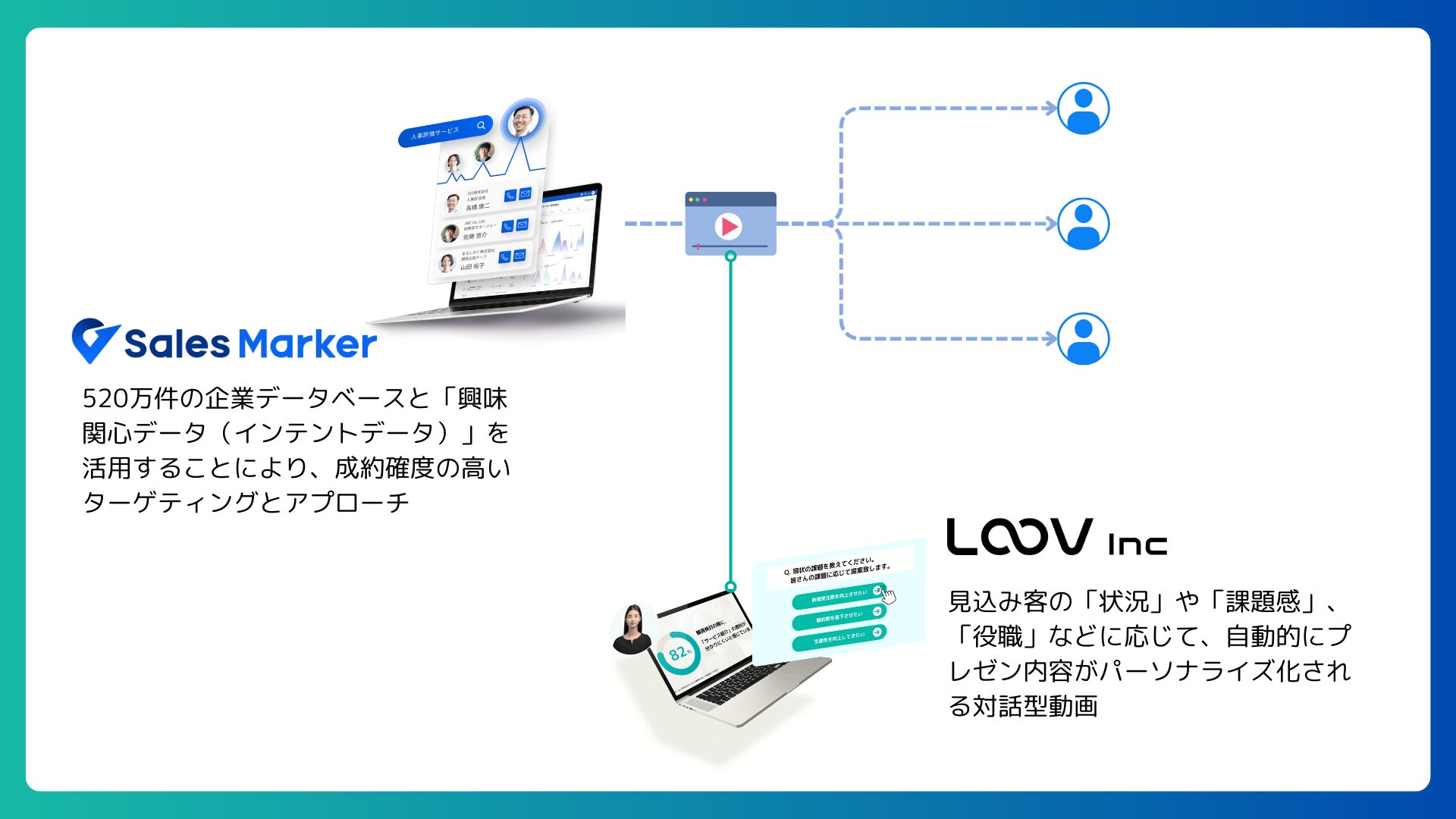 対話型パーソナライズ動画で営業DXを実現する「LOOV」(ルーブ)を展開する、株式会社LOOV(本社:東京都目黒区、代表取締役CEO:内田 雅人、以下LOOV)は、インテントセールスSaaS「Sales Marker」を提供する株式会社Sales Marker(本社:東京都港区、代表取締役 CEO:小笠原 羽恭)と共に、顧客起点の営業DXを実現するための協業を開始いたしました。