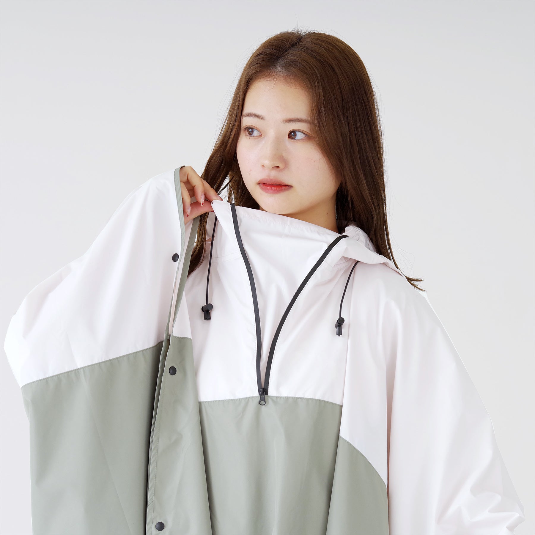 バイカラーの切り替えレインポンチョは、落ち着いたシックなカラーリングとゆったりしたサイズ感で性別問わず使えるデザインです。防水ファスナーを使用しているのでファスナー部分からの水の侵入を防ぎます。指に引っ掛けるループがついているので、袖口がめくれてくるのを防止します。