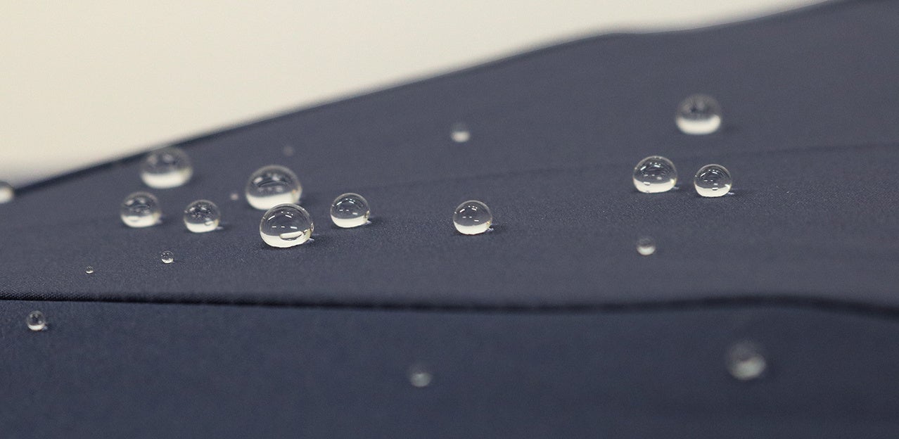水滴を弾く桃の皮(ピーチスキン)のように、生地の表面が微起毛になっている「Peach drop」は雨が当たっても一瞬で水滴を弾く超撥水素材です。
