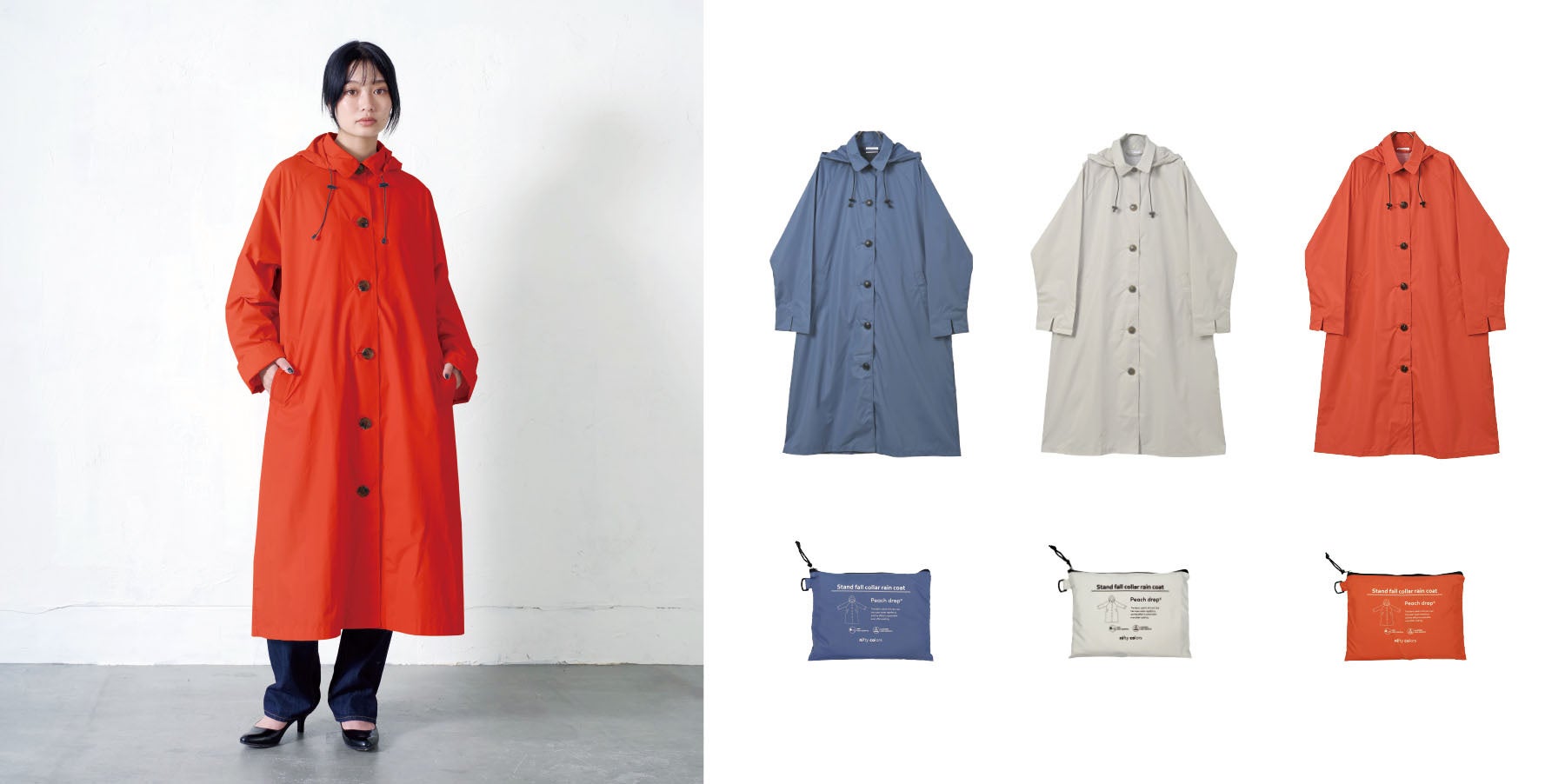 新しく加わったレインコートは定番のステンカラータイプ。スタンダードなデザインながら、ラグランスリーブでボリューム感のあるシルエットが特徴。フードは取り外し可能、袖口も折り返して長さを調節できます。ベーシックなカラーにビビットなカラーを加えた3色展開です。