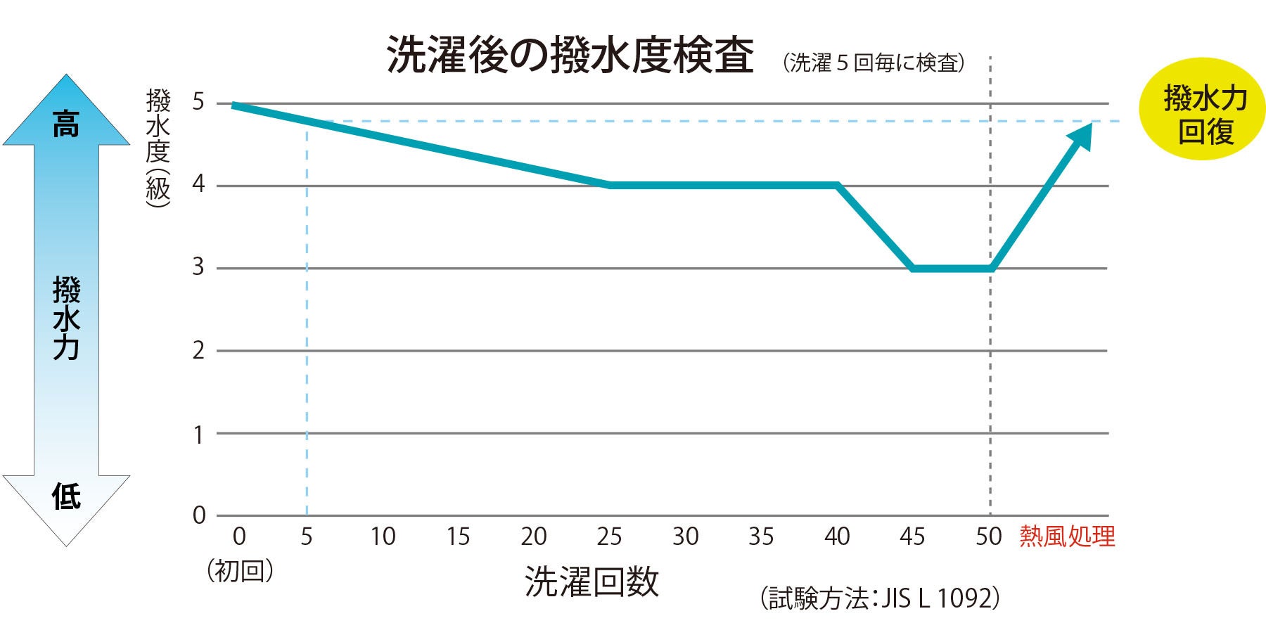 ・撥水の持続力が高くグラフの様に洗濯前の検査では撥水性の最高ランク5級を測定。