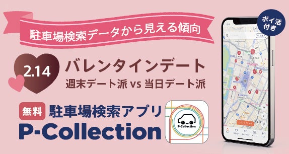 【無料】ポイ活機能付き駐車場検索アプリ「P-Collection(ピーコレクション)以下P-Collection」と駐車場専用マーケティングシステム「Park-Labo(パークラボ)以下Park-Labo」を運営する、パーキングサイエンス株式会社(本社:神奈川県藤沢市 代表取締役:井上直也)は、2024年2月の駐車場検索データをもとに、バレンタインデーの駐車場事情を調査しました。その結果、バレンタイン当日(2/14)の駐車場検索数は月平均より約26%少なく、意外にも駐車場が空いている可能性があることが分かりました。一方で、2月の週末(土・日)の検索数は月平均の約1.3倍と増加しており、バレンタインデートは週末にシフトする傾向があることもわかりました。
