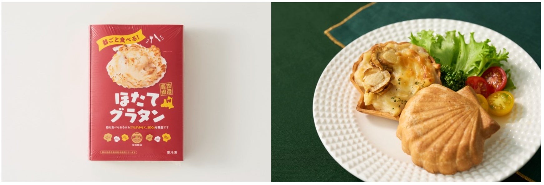 たまねぎペーストをふんだんに使用したこだわりのホワイトソースは、濃厚でコクの深い味わいが特徴です。また、グラタンを包むのは「ほたて貝型の可食容器」。青森県産の米粉を使用し、従来の可食容器に比べてサクサクとした食感に仕上がりました。