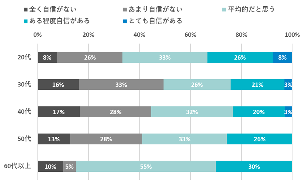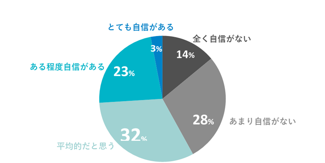 一方で「あまり自信がない」(28%)、「まったく自信がない」(14%)を合わせると約4割にのぼり、「平均的」とした人(32%)を含めると、多くの人が自信を強く実感できていないことがわかります。