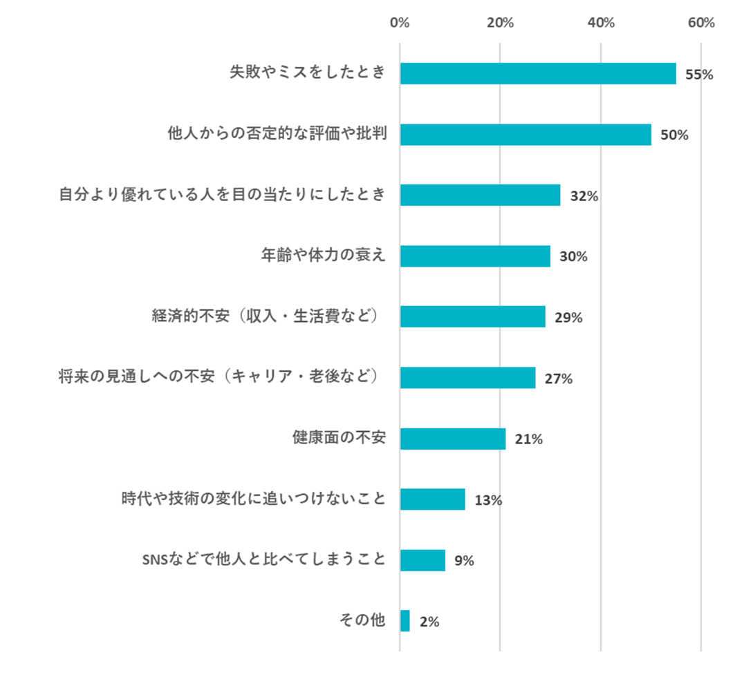 「失敗やミス」(55%)、「他人からの否定的な評価」(50%)が上位。社会的評価や挫折経験が、自信を失う大きな要因となっている。 -