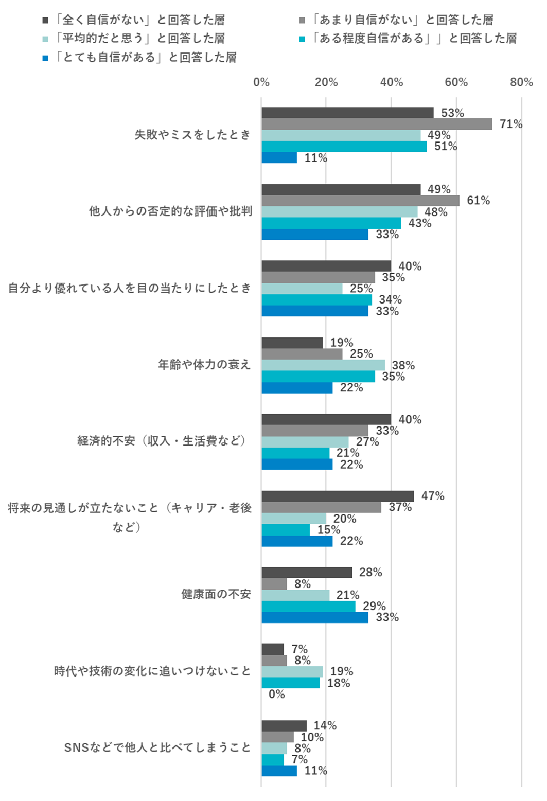 自信の度合いが低い層ほど、「失敗やミスをしたとき」(71%)や「他人からの否定的な評価や批判」(61%)を自信を揺るがす要因として挙げる割合が高くなりました。