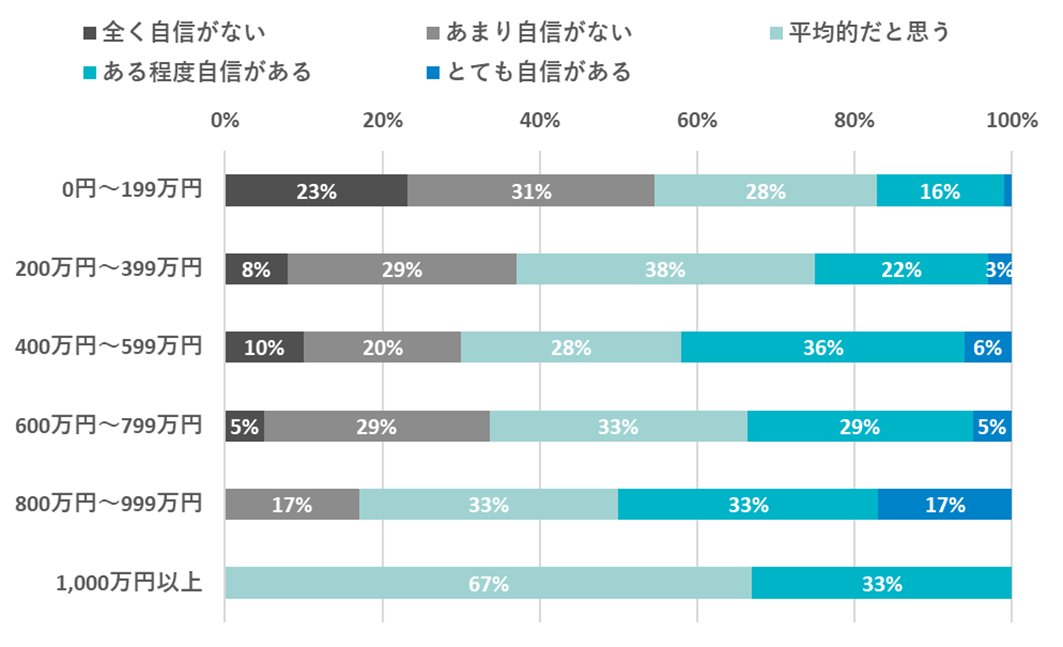 年収1,000万円以上では全員が「平均的」「自信がある」と回答しています。反対に、年収200万円未満の層では「全く自信がない」「あまり自信がない」が過半数を占め、自信の低さが際立ちました。