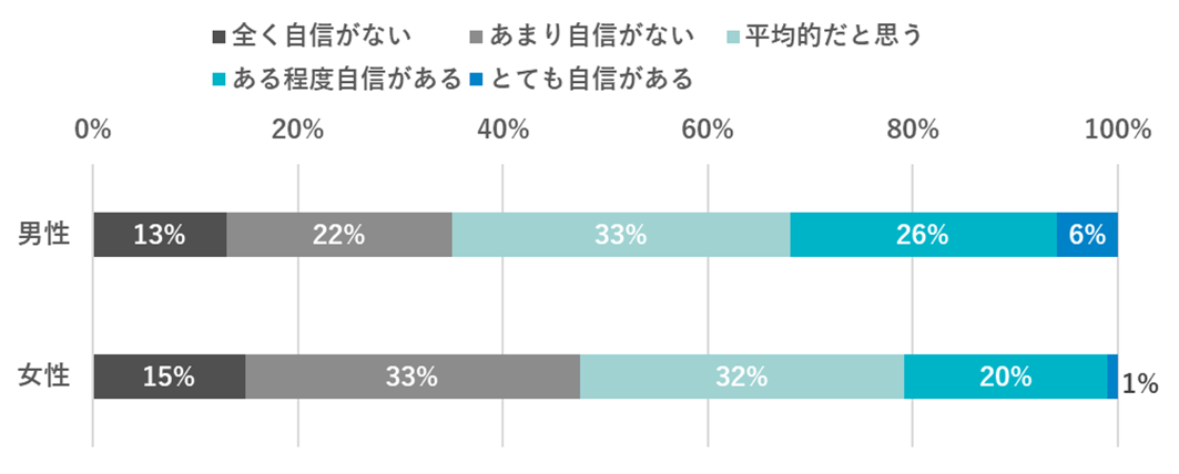 女性の自信度は男性より低く、「自信がない」と回答した割合が男性より13ポイント高い