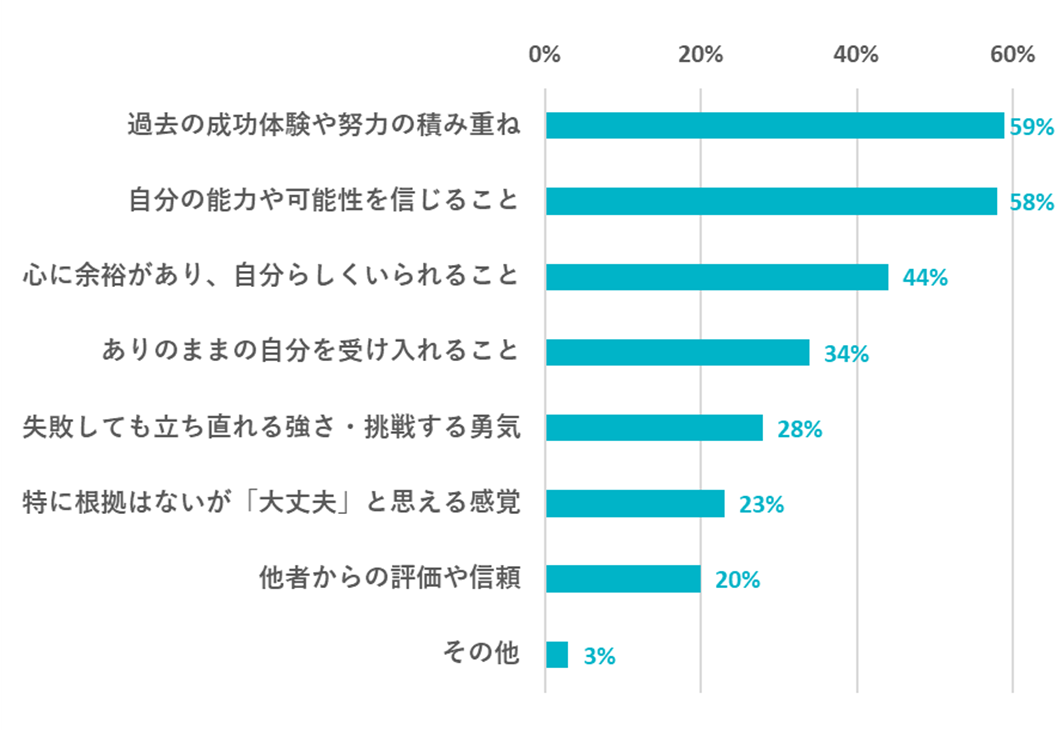 最多は「成功体験や努力の積み重ね」(59%)と「能力や可能性を信じること」(58%)で、自信を“自分で築く”意識が強い