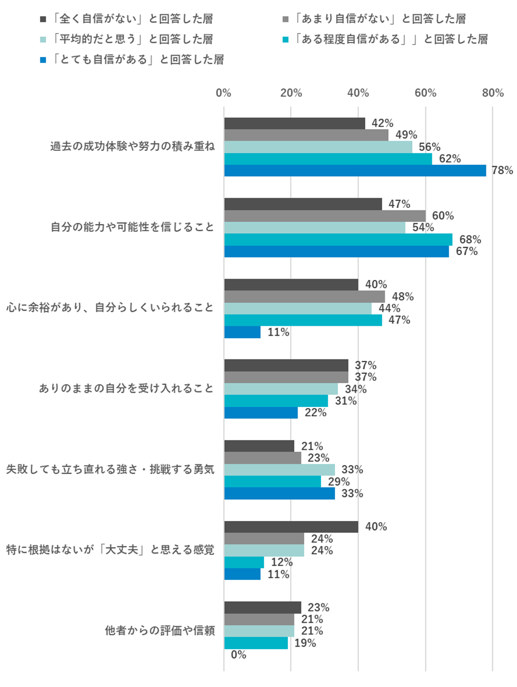 一方で、自信が低い層では「特に根拠はないが『大丈夫』と思える感覚」(40%)や「他者からの評価や信頼」(23%)の割合がやや高く、外的な安心感に依存する傾向が見られました。