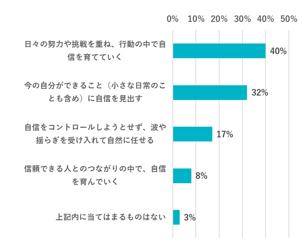 最も多かったのは「日々の努力や挑戦を重ね、行動の中で自信を育てていく」(40%)で、次いで「今の自分ができることに自信を見出す」(32%)が続きました。