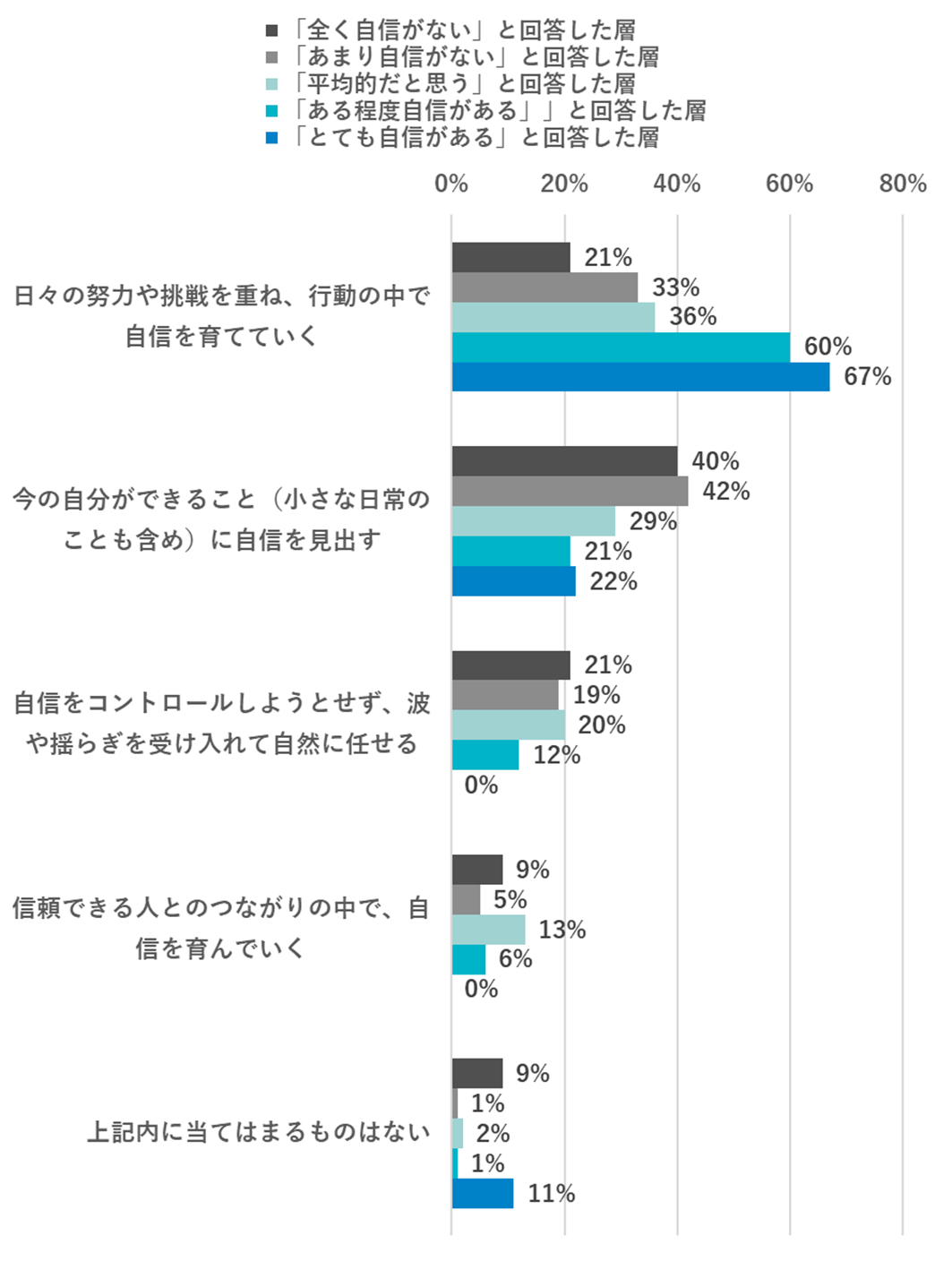 自信の高い層ほど「日々の努力や挑戦を重ね、行動の中で自信を育てていく」を選ぶ割合が高く、「とても自信がある」層では67%、「ある程度自信がある」層でも60%に達しました。