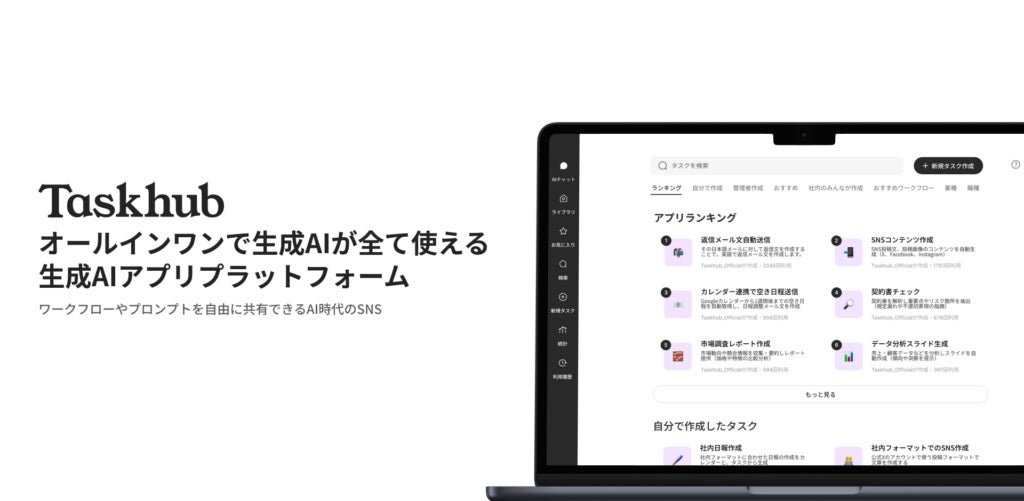 Taskhubは、専門知識がなくても直感的な操作でAIアプリを構築できる、ノーコードAIワークフロー作成プラットフォームです。データの収集・加工からAIによる自動処理までワンストップで実現し、業務の効率化や新たなサービス創出を支援します。